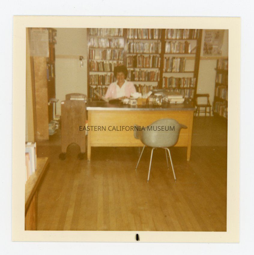 Color photo of a librarian sitting behind a desk. Likely the Independence branch.