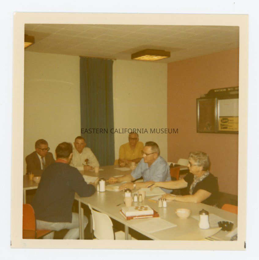 Color photo of a group of people sitting around some tables. Sugar, salt, pepper, and mugs are on the tables.