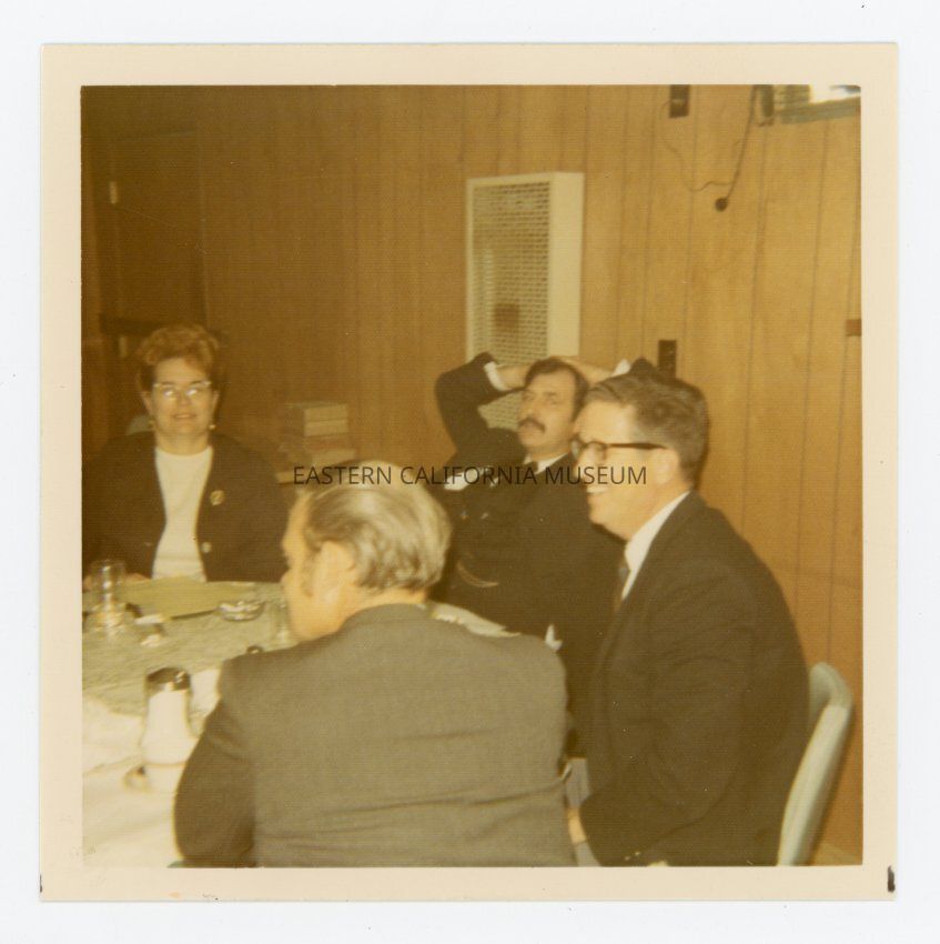 Color photo of a group of four people sitting at a table, perhaps after having eaten a meal.