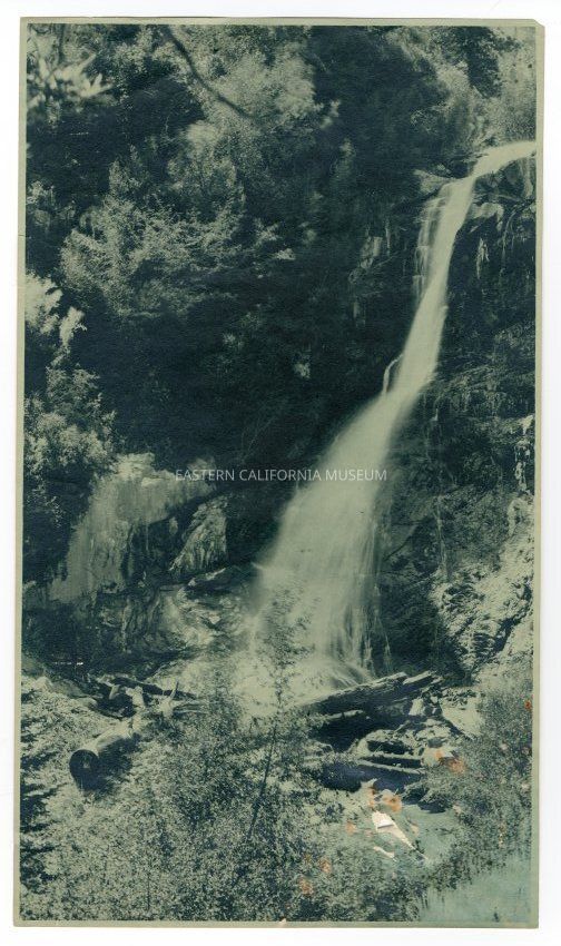 Large, green-tinted photo of a waterfall with logs at the base. Stamped on reverse: Enlargement by Howland & Dewey Co.