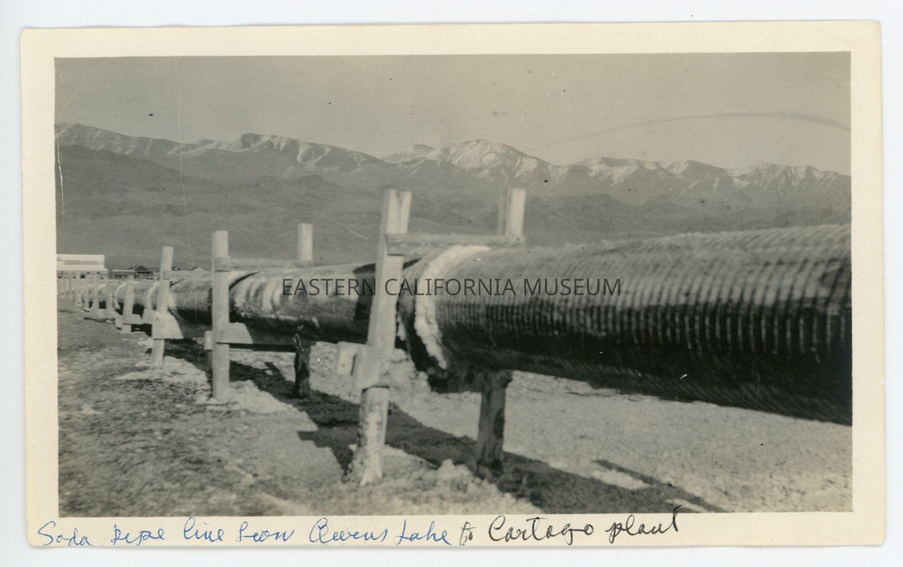 Photo captioned, "Soda pipeline from Owens Lake to Cartago plant." It shows a raised or elevated pipeline on wooden trestles with a building and mountains in the background.Collection