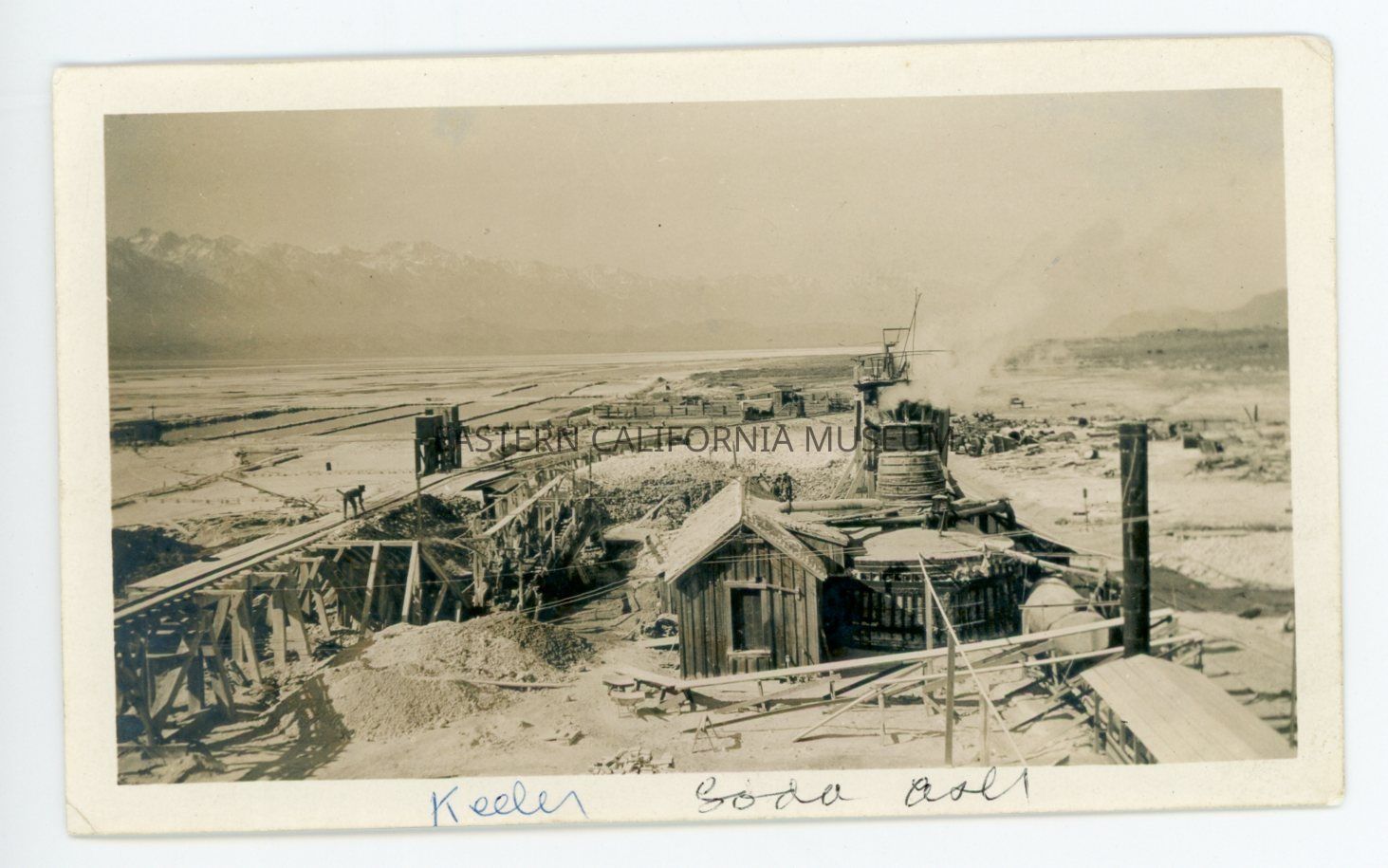 Photo captioned, "Keeler, soda ash." it shows several structures, railroad tracks on a raised wooden trestle, evaporation ponds on Owens Lake, and the Sierra Nevada mountain range in the background. A structure in the center-right appears to be smoking.