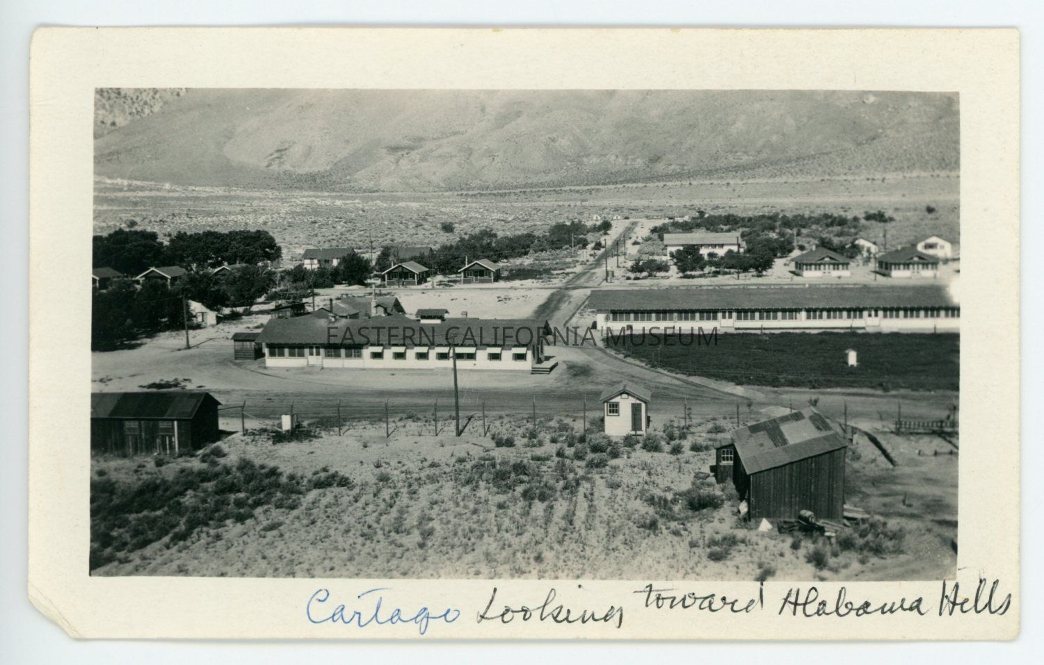 Photo captioned, "Cargato looking toward Alabama Hills." It shows two long, barrack-style buildings in the center, and houses nestled among trees along the left side.Collection