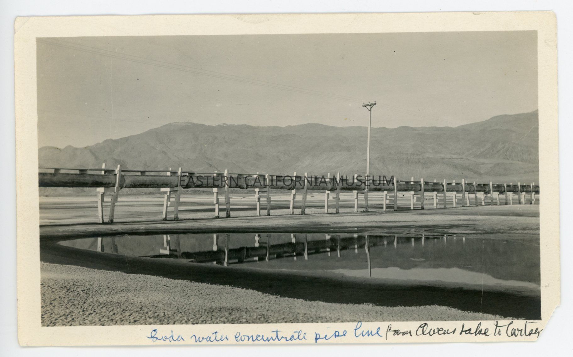 Photo captioned, "Soda water concentrate pipeline from Owens Lake to Cartago." It shows a raised or elevated pipeline on wooden trestles with a power line and mountains in the background. There is some water in the foreground reflecting the scene.Collection