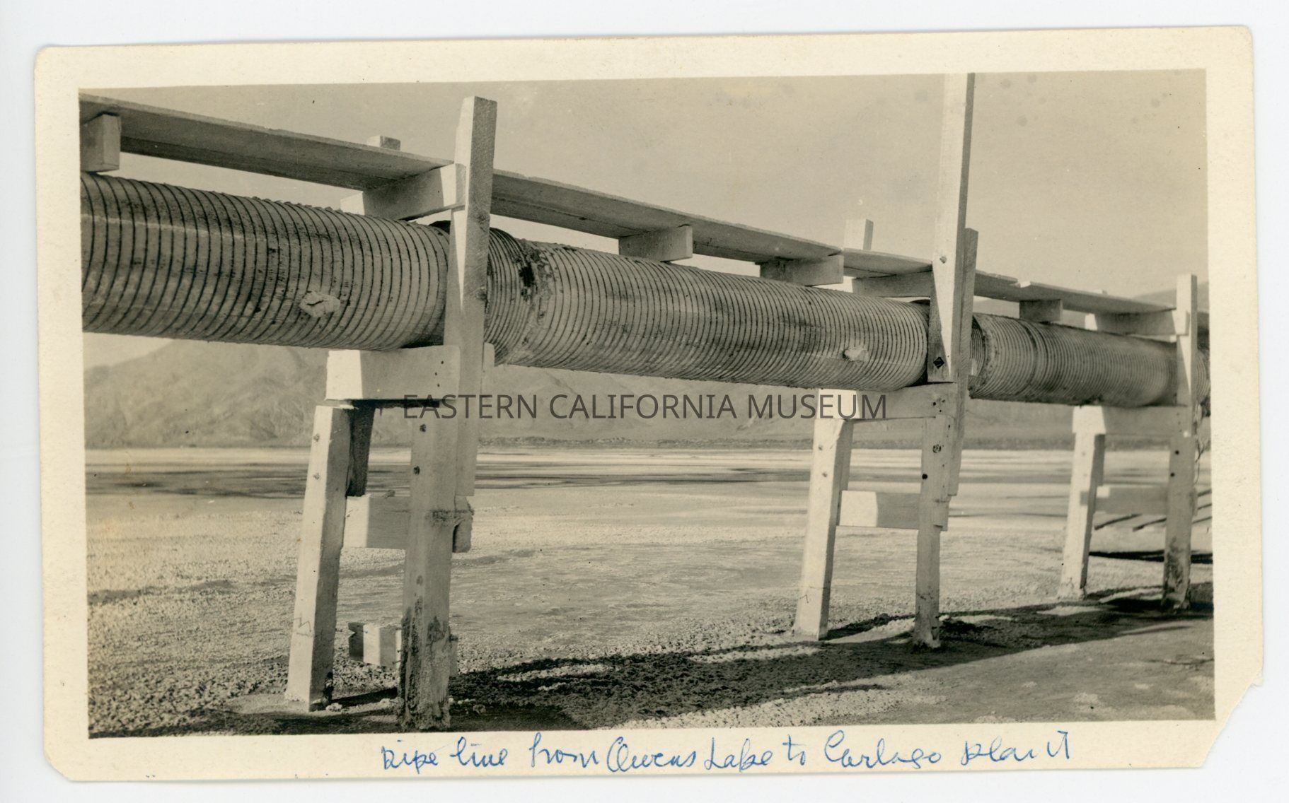 Photo captioned, "Pipeline from Owens Lake to Cartago plant." It shows a close-up view of a raised or elevated pipeline on wooden trestles.