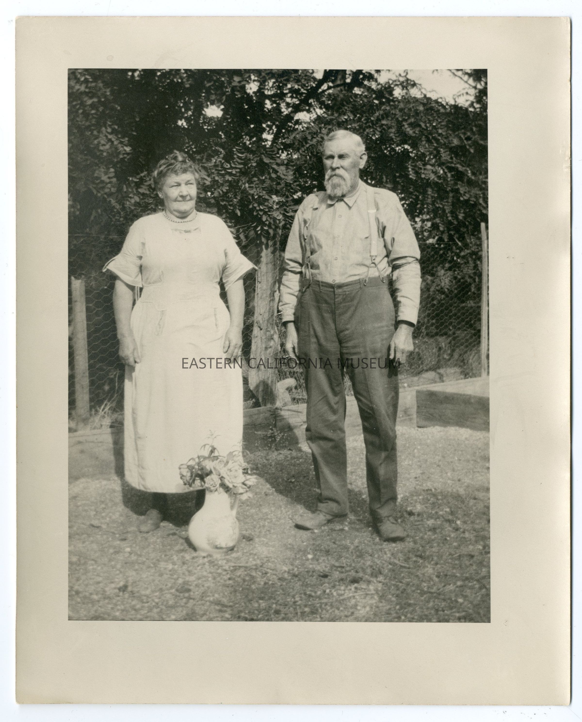 Picture of a couple identified as Amelia and Mike Anton. They are standing outside, and there is a pitcher with flowers at Amelia's feet.Collection