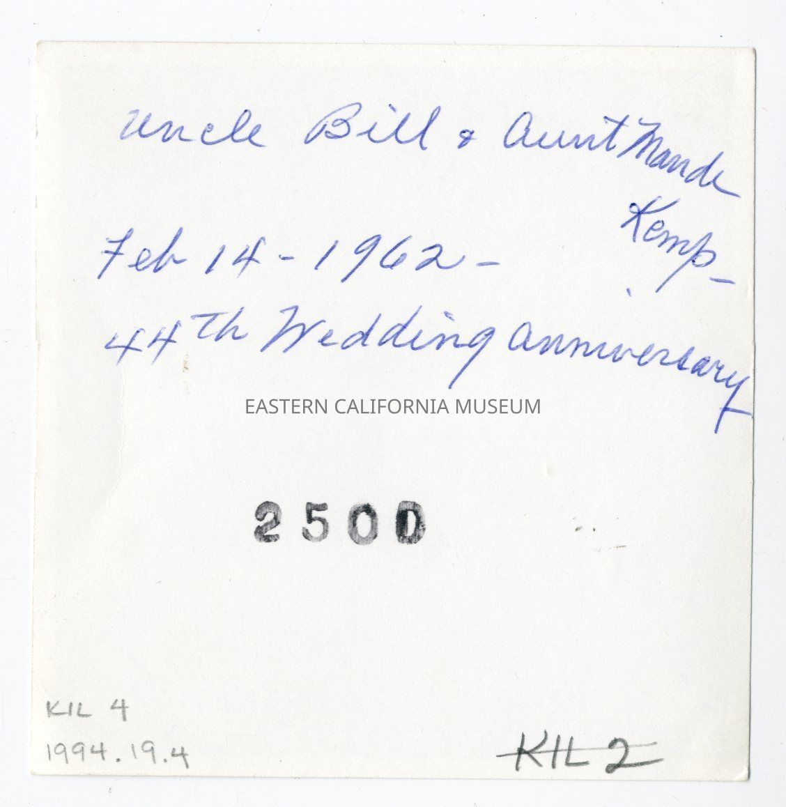 Written in blue ink on reverse: Uncle Bill and Aunt Maude Kemp, Feb. 14, 1962, 44th Wedding Anniversary.Collection