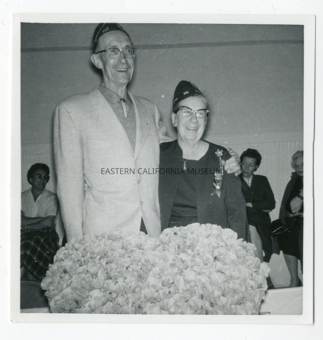 Photo of a man with his arm wrapped around a woman. They are both wearing what appears to be American Legion and Women's Auxiliary caps. She is also wearing a number of pins and ribbons.