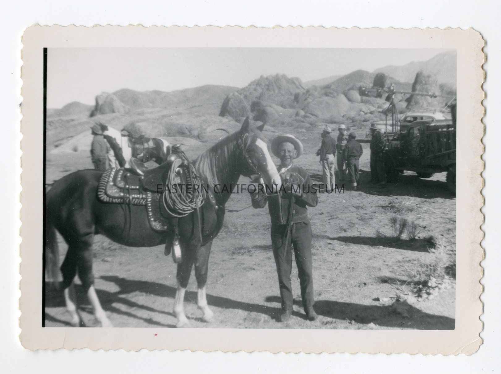Photo of a man holding the reins to a saddled horse. There is a movie or filming truck in the background. Location is the Alabama Hills. Although there is nothing written on the back of the photo, was taken at the same time as 1994.33.1.9, which identifies it as Gene Autry's horse taken on 11/11/49.Collection