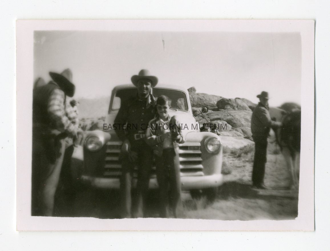 Small, blurry copy of photo 1994.33.1.14. It is a photo of Gene Autry and Bill Johnson (son of Clarence H. and Agnes Johnson) leaning against the front grill of a truck. There are other cowboys around them and the Alabama Hills in the background. It was taken on 11/11/49.Collection