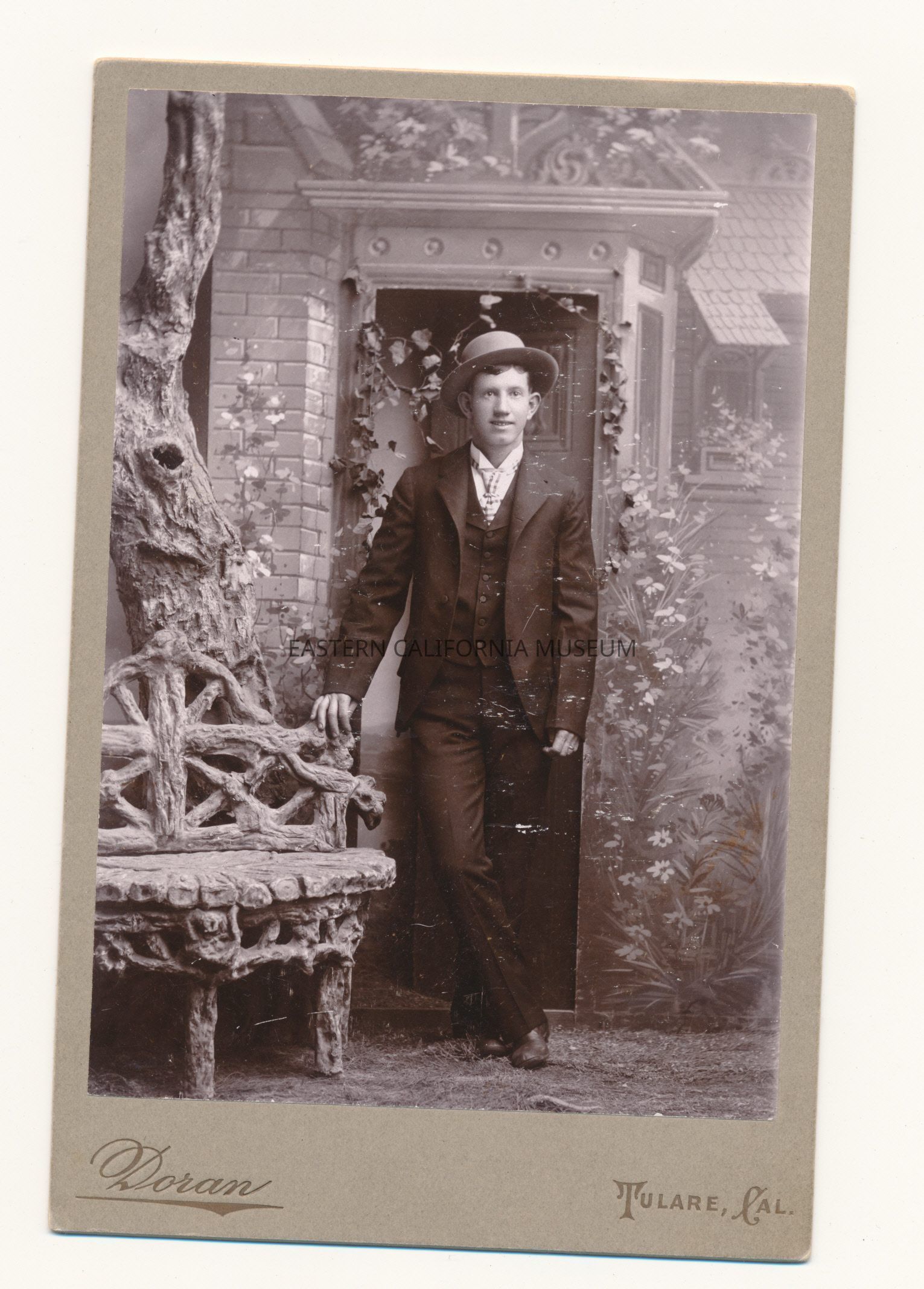 Mounted studio portrait of a young man identified as William Calvert. The photographer was Doran of Tulare, CA.