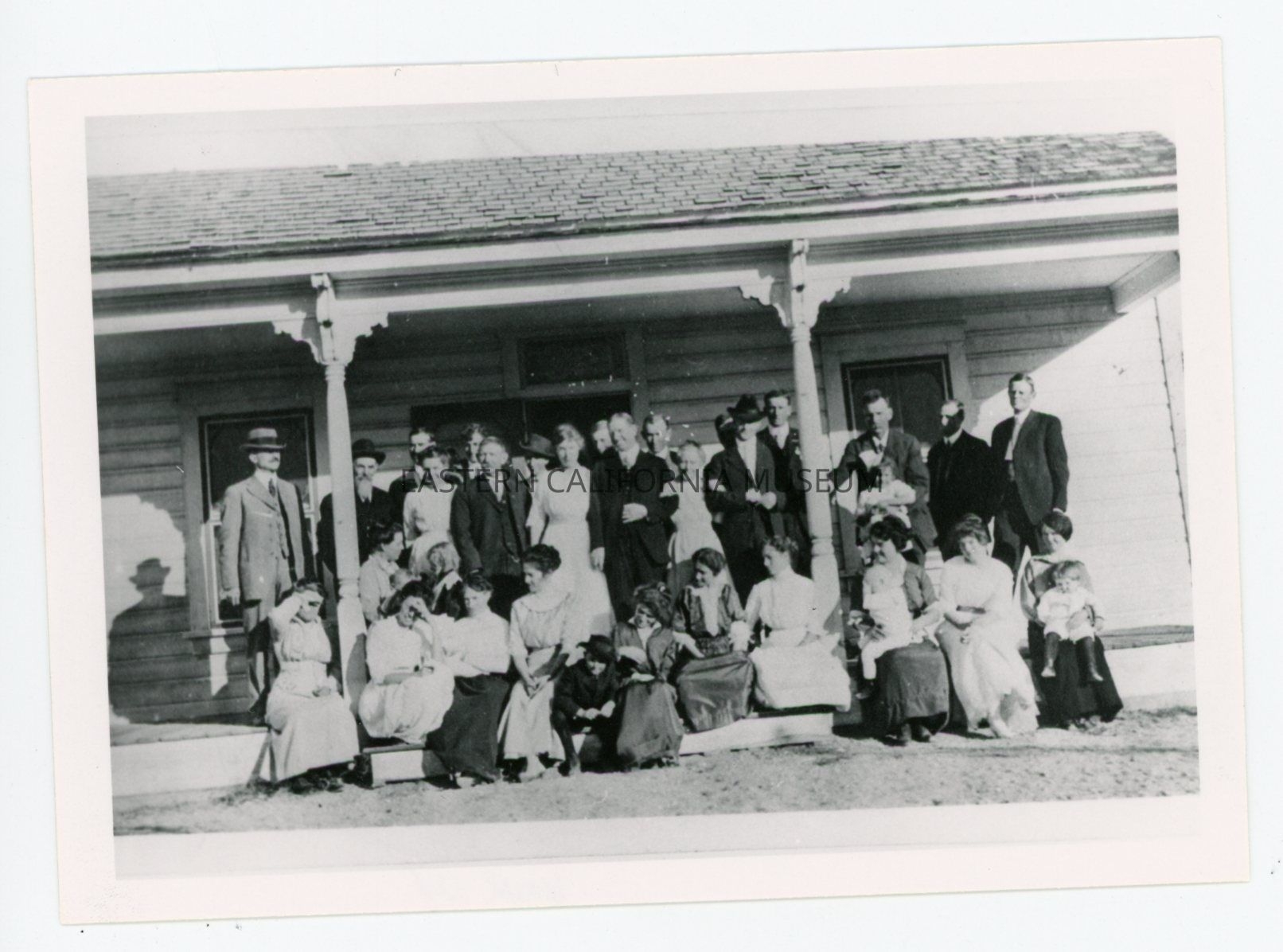 Copy of a photo of the wedding reception for William "Willie" Calvert and Astrid [unknown maiden name] Calvert at Calvert Ranch in Aberdeen. Judge Dehy, who is in the photo, performed the ceremony.