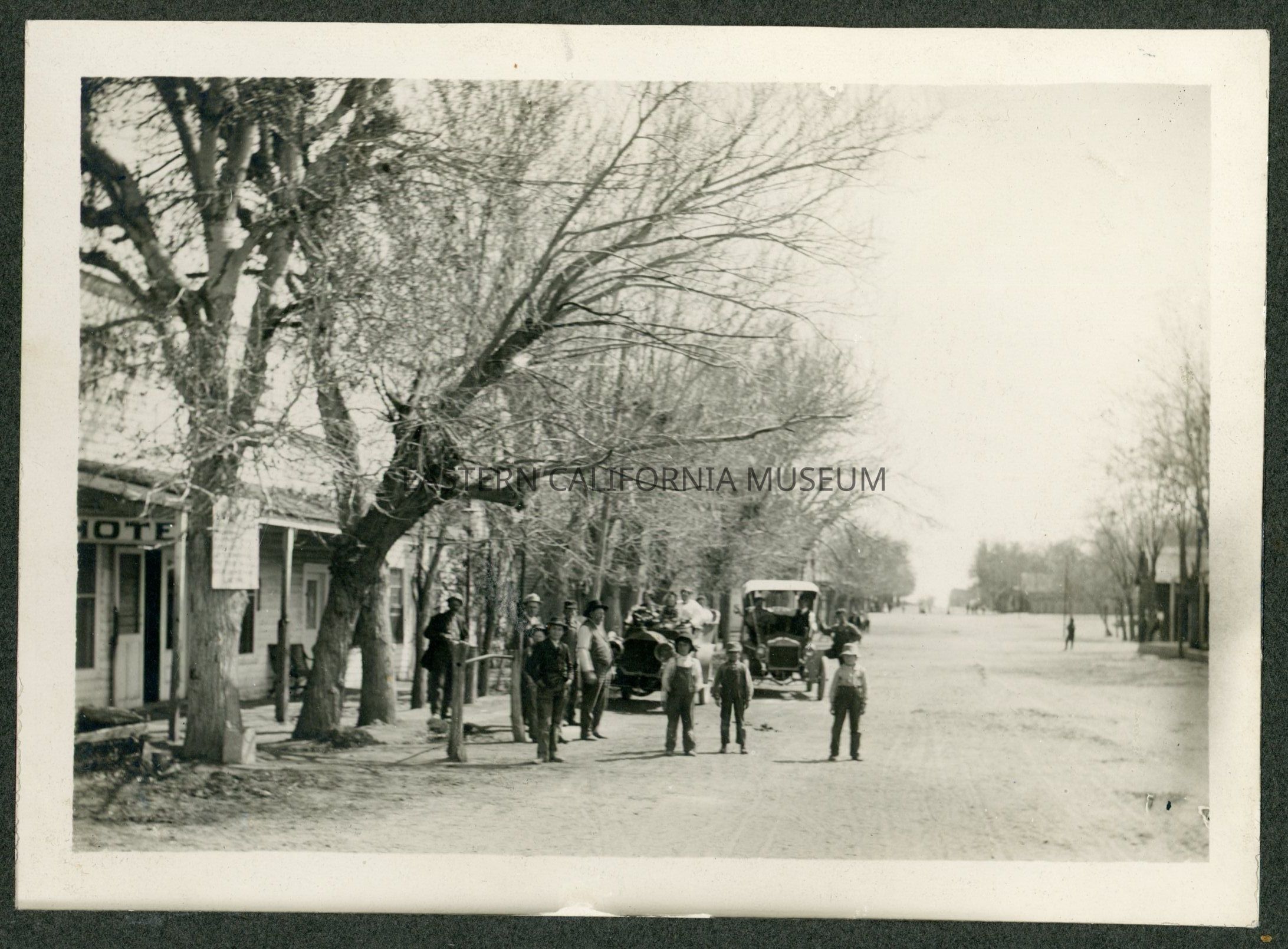 Mounted photo of a group of people (including several children) standing in the street in front of a hotel. There are two automobiles in the background, a hitching post in front, and several large mature trees.