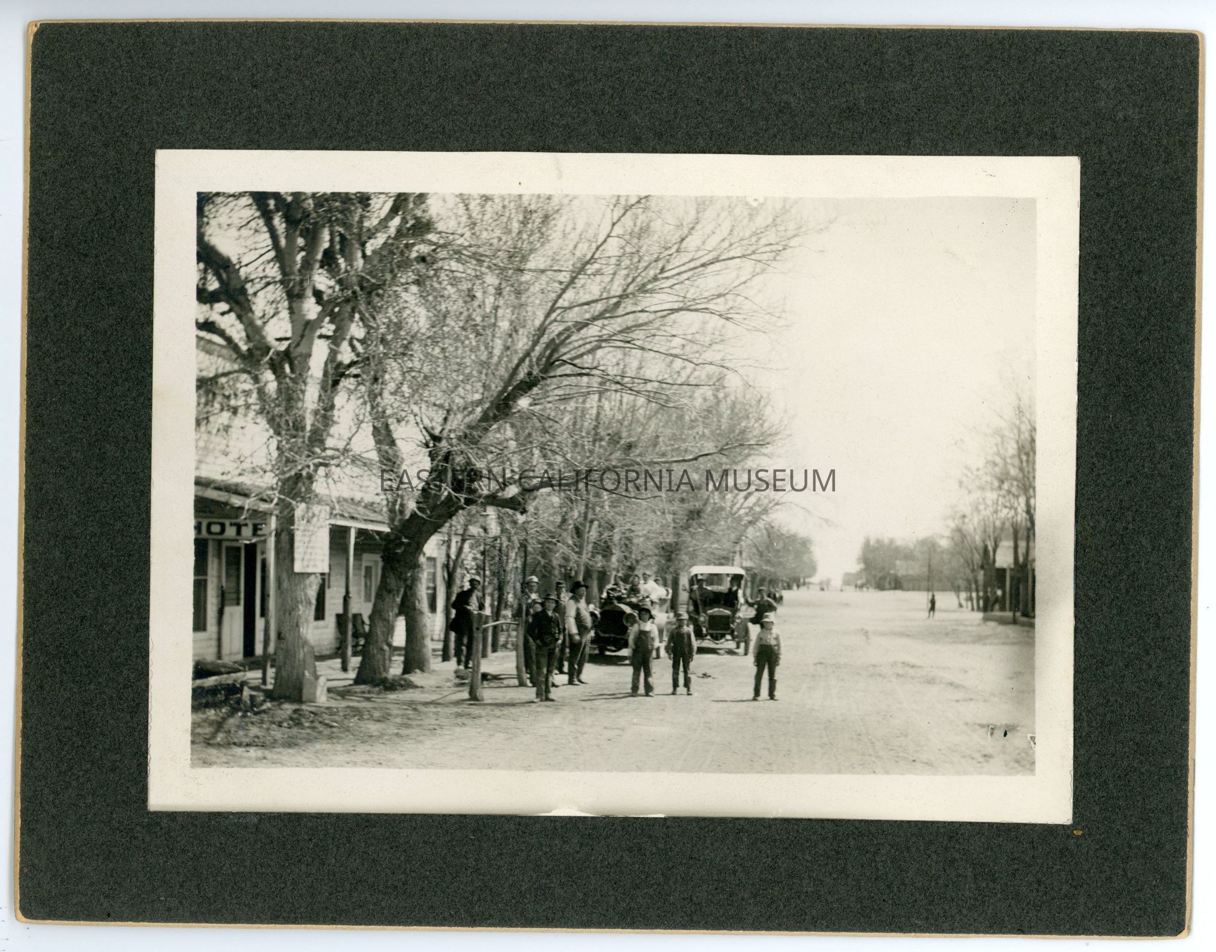 Handwritten in pencil on reverse: Lone Pine, front of Mt. Whitney Hotel, 2nd person in front is John Charles Anton, about 1910 or 1911.