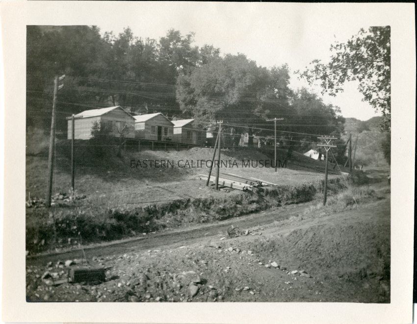 B & W matte print of LA Aqueduct Construction Camp, location unknown: Oak trees and vegetation may place it in the foothills.