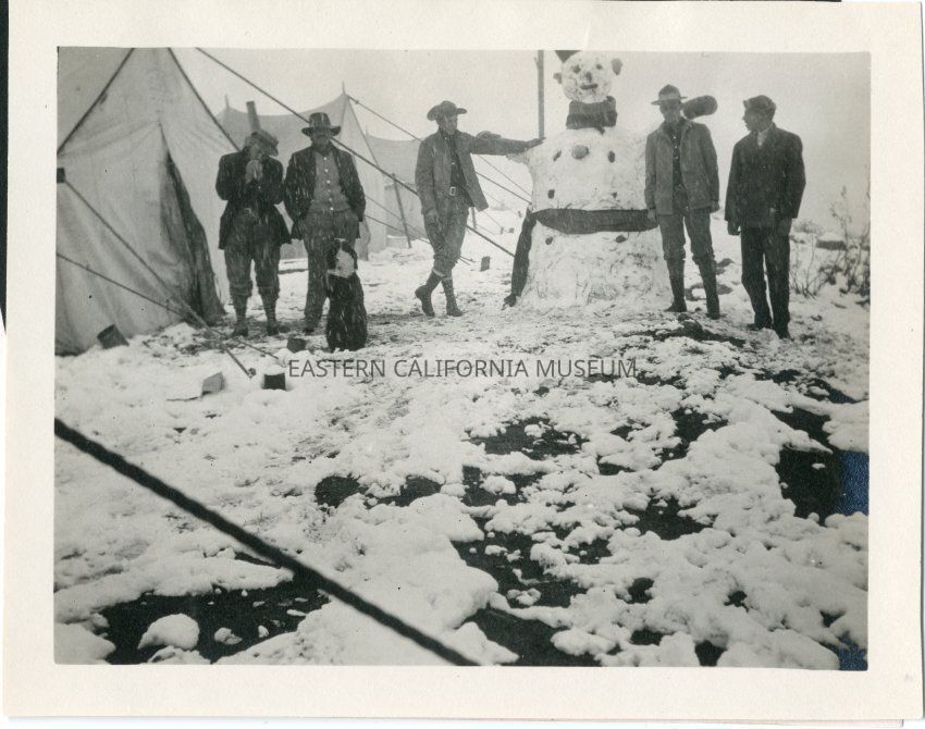 B & W matte print of Aqueduct Laborers and Dog standing next to Snow Man at Aqueduct Construction Camp. Winter in Construction Camp; LA Aqueduct; Owens Valley Weather.Collection