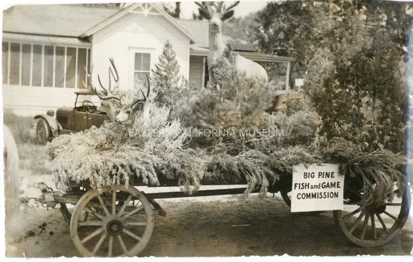 Photo of the Big Pine Fish and Game Commission float. It is decorated with a stuffed deer, shrubbery, and tree branches on a horse-drawn wagon. There is a house and early automobile in the background.