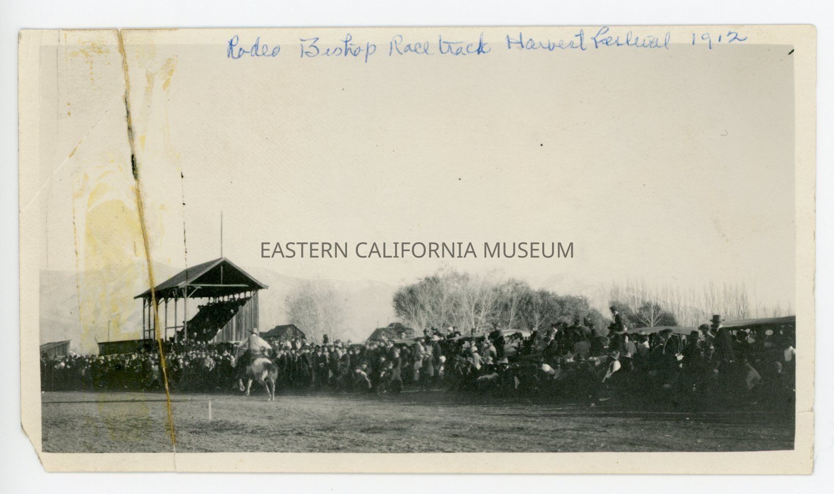 Photo of a huge crowd of spectators watching a man on a horse. There is a grandstand on the left side. Written in blue ink on photo is, "Rodeo, Bishop Race Track, Harvest Festival, 1912."