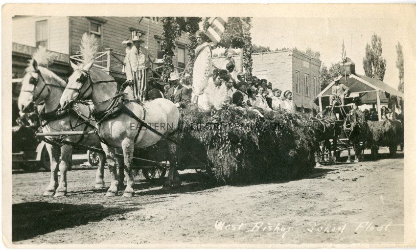 Photo titled, "West Bishop School Float." It shows an elaborately decorated wagon full of school children pulled by two white horses (with matching white plumes). There are two people dressed in costumes standing at the front of the wagon (one is Uncle Sam). They are participating in the Harvest Festival parade in 1912.
