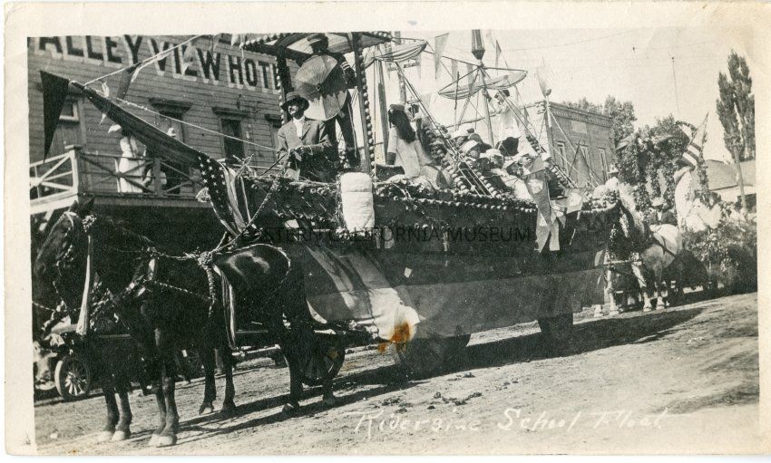Photo titled, "Riverside School Float." It shows a horse-drawn wagon pulled by two black horses. The wagon has been decorated to look like a ship compete with prow and masts. There are several people sitting in the wagon, including one standing behind the driver holding a round disc. The Valley View Hotel is visible in the background. It is participating in the Harvest Festival parade in 1912.