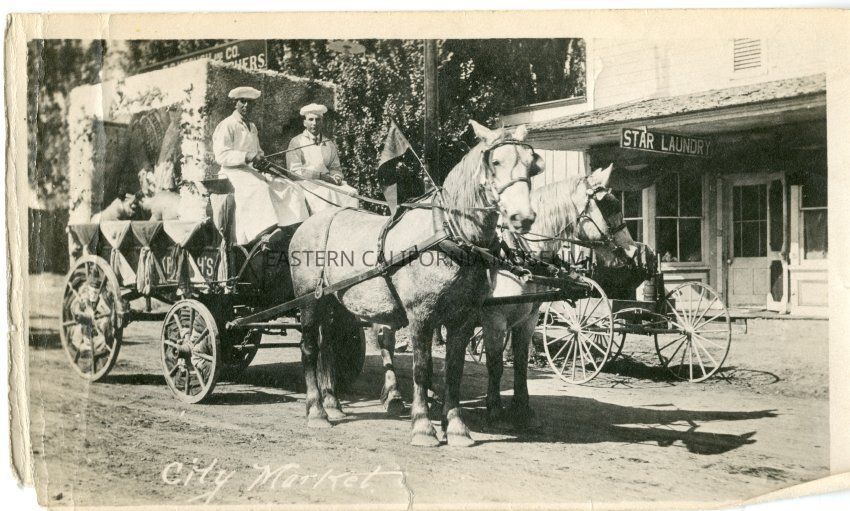 Photo titled, "City Market." It shows two men wearing white aprons and hats driving a horse-drawn wagon float. There are two signs in the background, one of which is "Star Laundry" and the other is mostly obscured behind the float. It is participating in the Bishop Harvest Festival parade in 1912.
