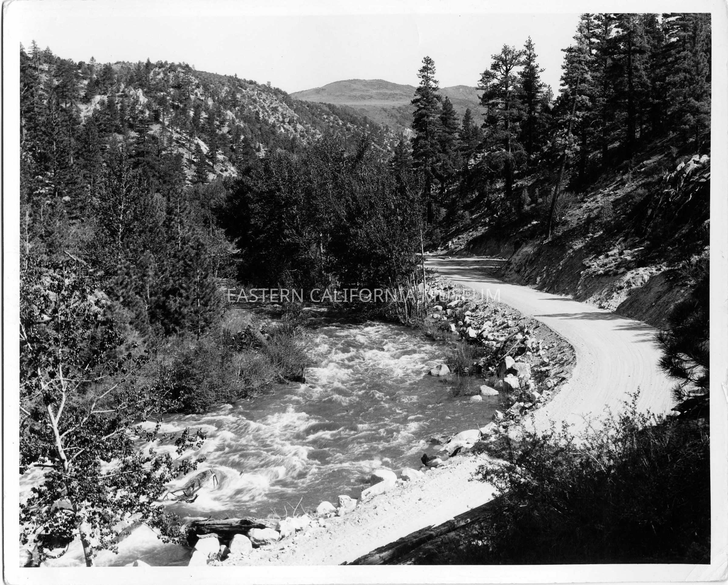 Photo of a rushing river and dirt road curving gently together through a narrow mountain pass.