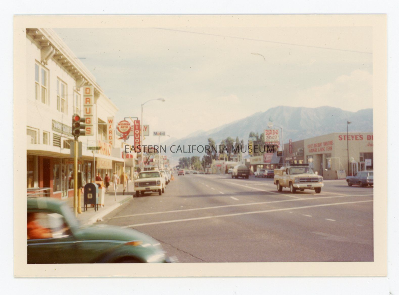 Color photo taken at the corner of Main and Line Streets in Bishop looking south. There are many stores visible, including a drugs store, Wards, Western Auto, liquor story, Mobile, Sporting Goods, BBQ Bill's restaurant, Steve's Discount Furniture, and a motel.