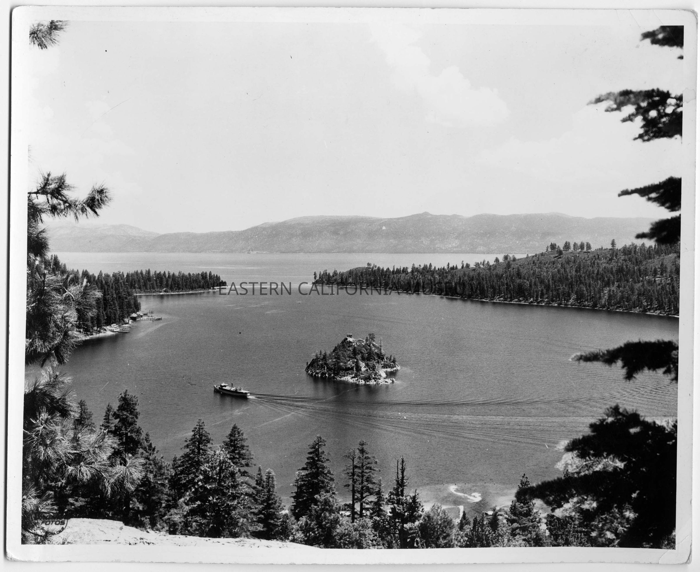 Photo of a boat sailing on in Emerald Cove on Lake Tahoe.There is a small island in the middle.
