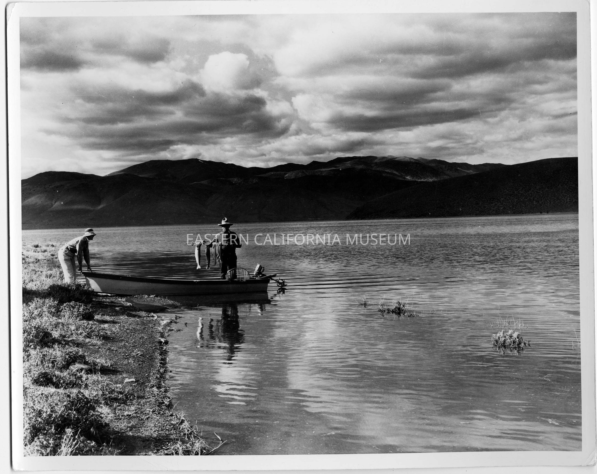 Photo of a fisherman holding up his catch on a fishing pole while standing in a motorized boat in a lake. There is a woman on the shore keeping the boat steady.