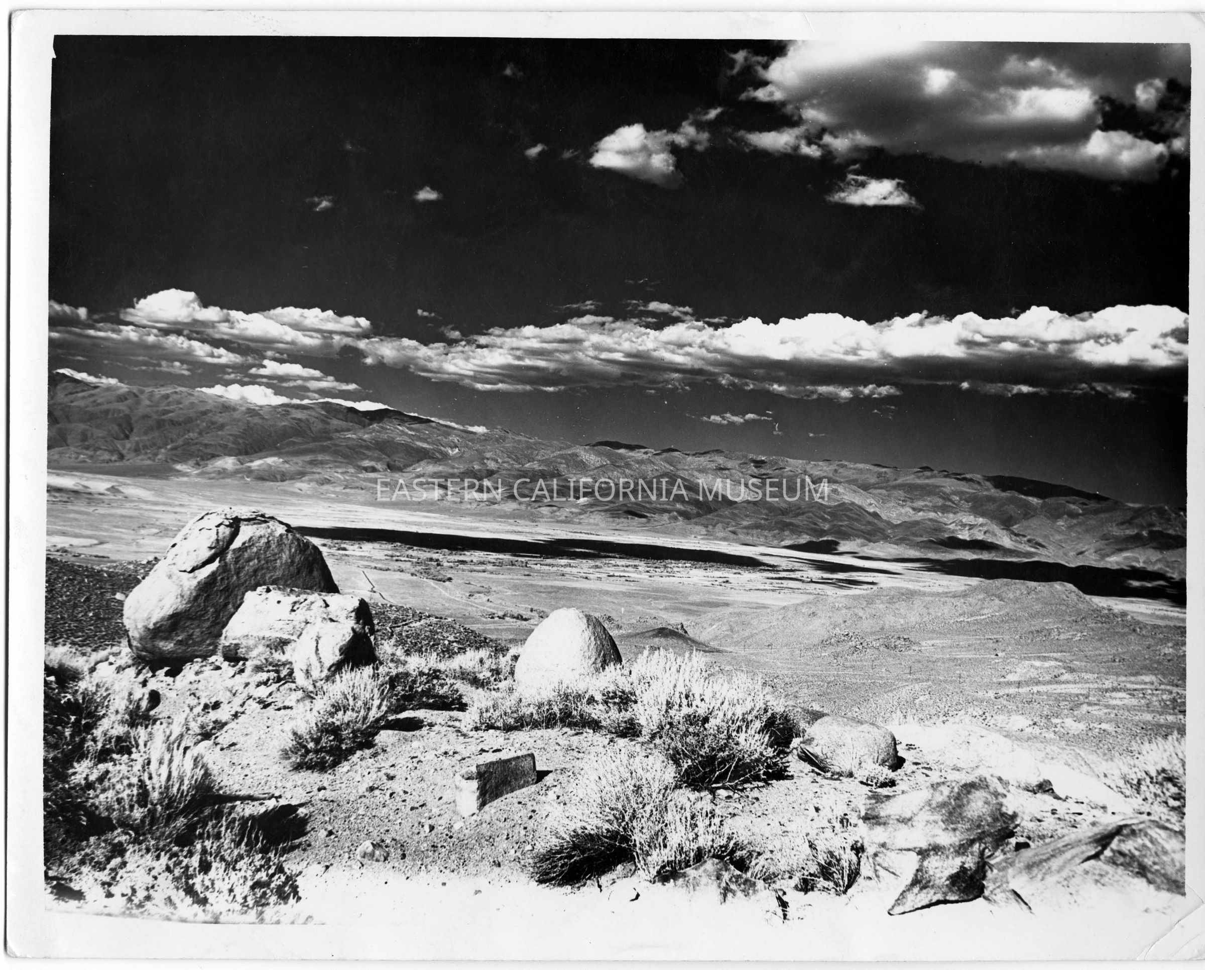 Photo of the town of Bishop taken from a high vantage point in the west looking east towards the White Mountains. There are some boulders and sagebrush in the foreground.