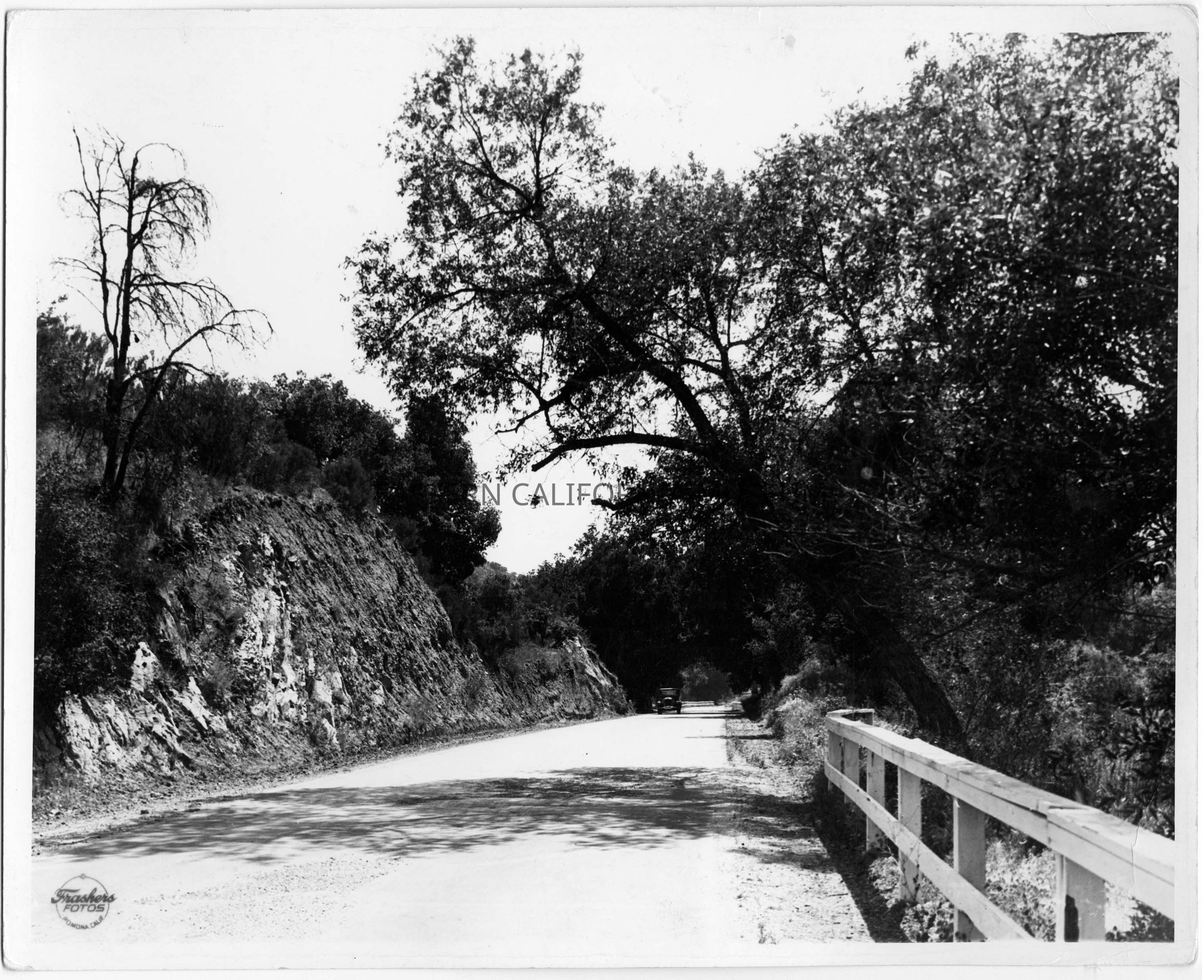 Photo of a road with a white guardrail on the right side and a tree hanging over the road. There is an early automobile in the distance coming towards the camera.