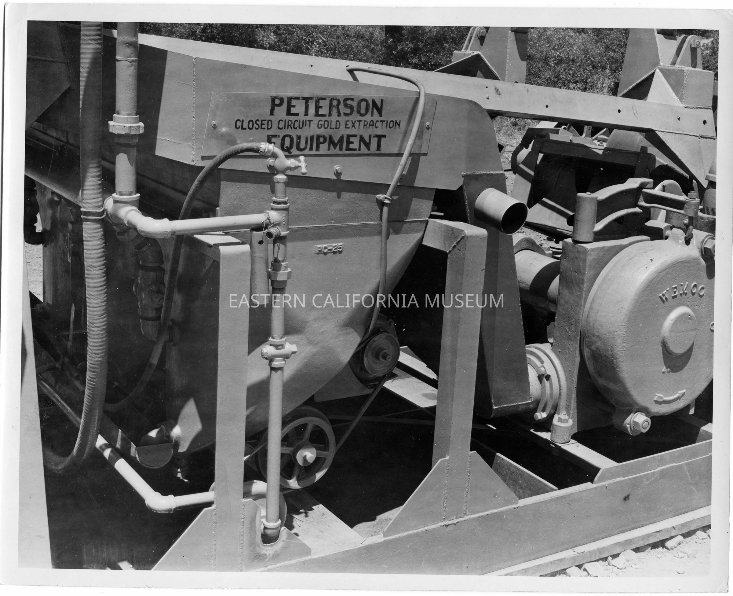 Photo of 20th century mining equipment. A label on the equipment says, "Peterson Closed Circuit Gold Extraction Equipment."