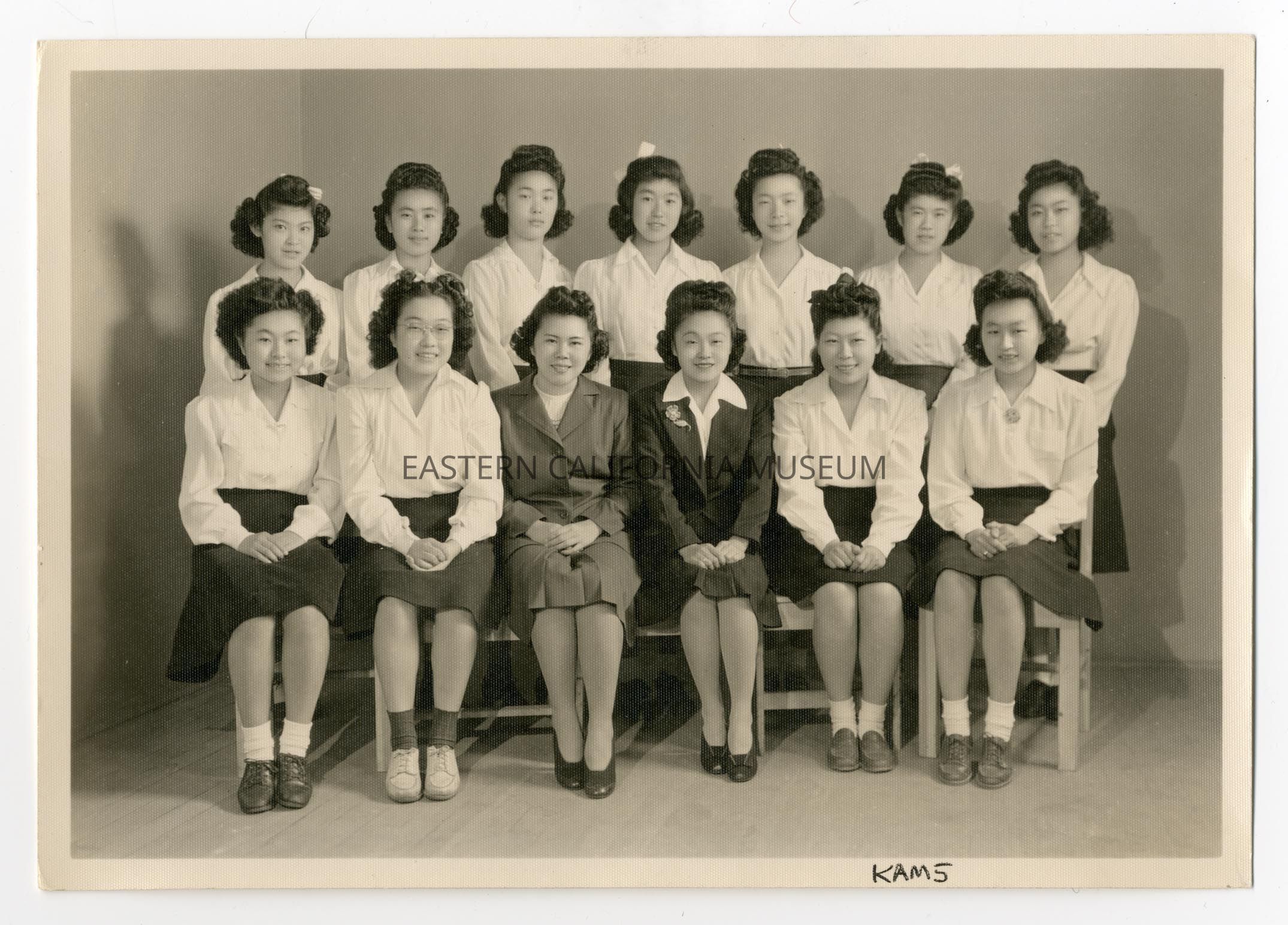 Interior photo of a group of 13 young women. They are members of the Roughnecks.Photograph Details