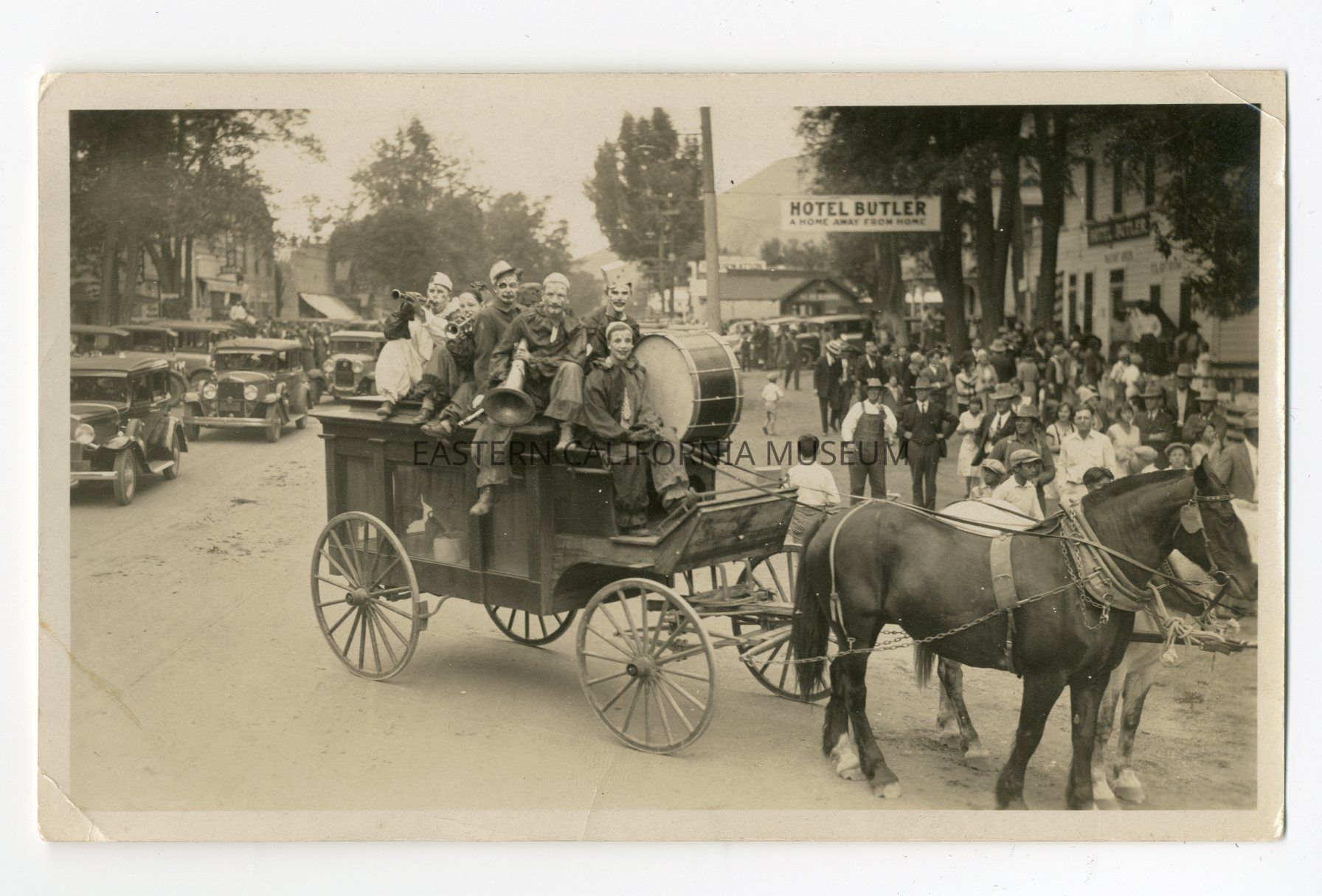 Photo taken during the Big Pine Pioneer Pageant parade in April 1931. It shows a group of clowns with instruments riding on top of a hearse down Main Street in front of the Hotel Butler. There is a large crowd of people on the right side, and a row of early automobiles on the left side.