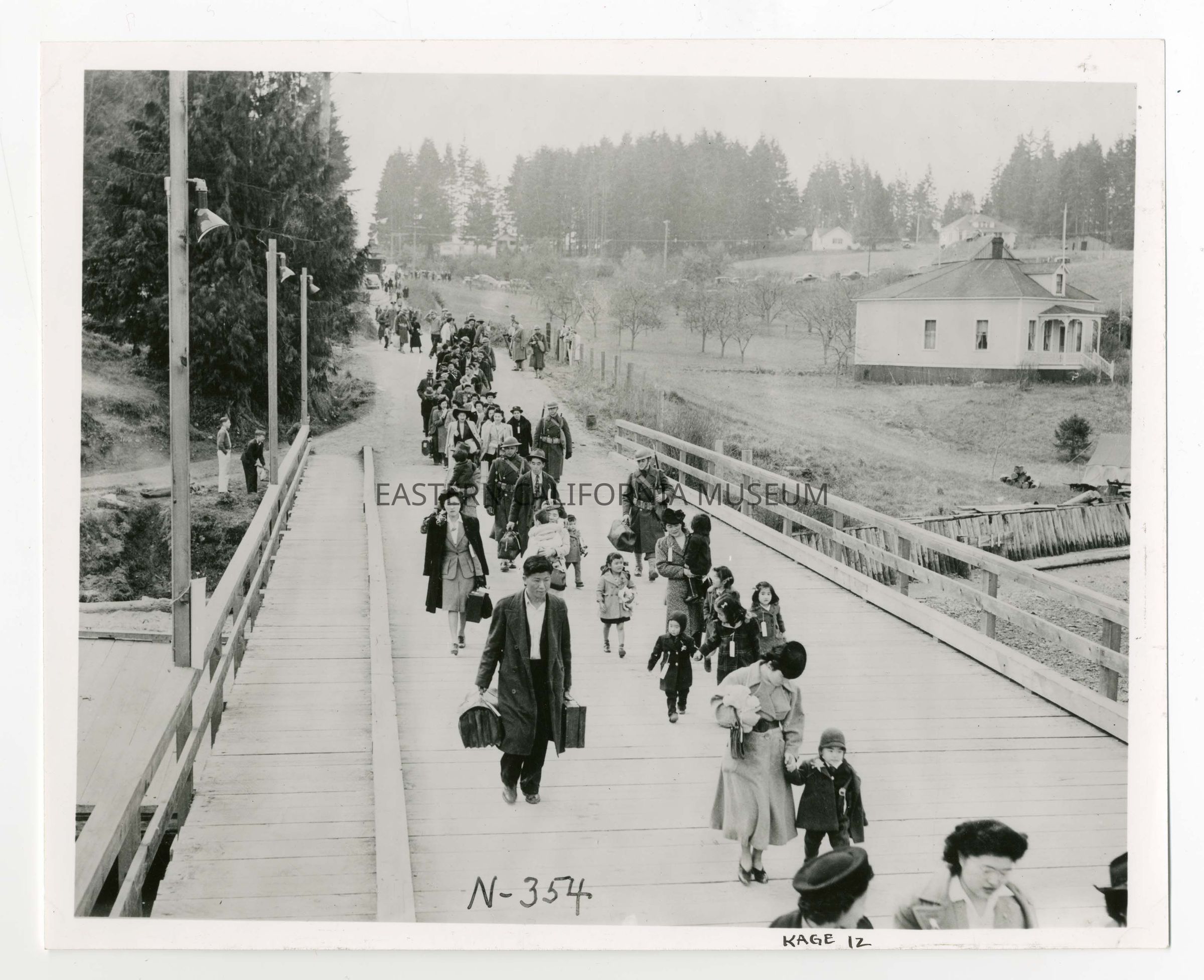Photo of a long line of people (men, women, and children) walking along a wooden bridge towards the camera. Written on the bottom center of the image is "N-354."