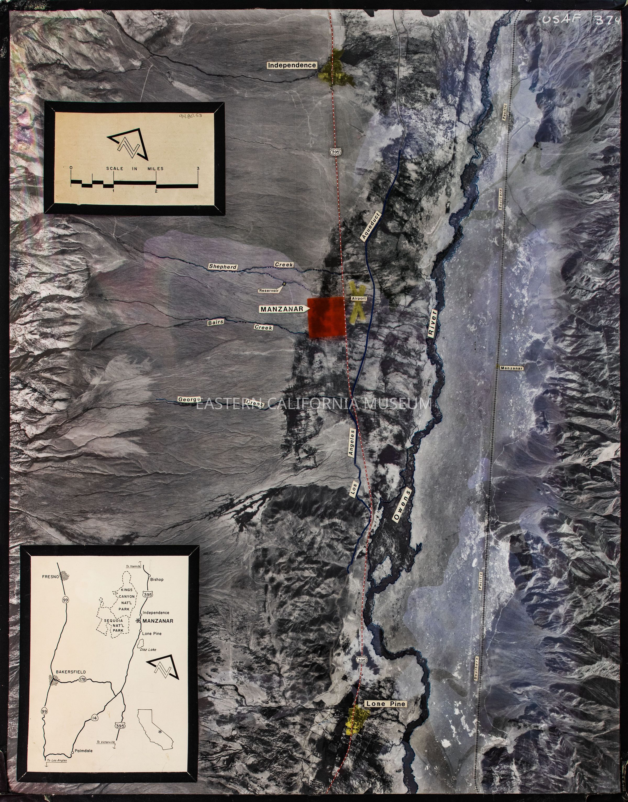 Enlarged aerial photo of area from Independence to Lone Pine and base of Sierra to base of Inyos. Has Manzanar and various creeks, highway, etc. highlighted. Marked USAF 374. Also has map of Manzanar/Fresno/Bakersfield area to show geographic location in California.Collection