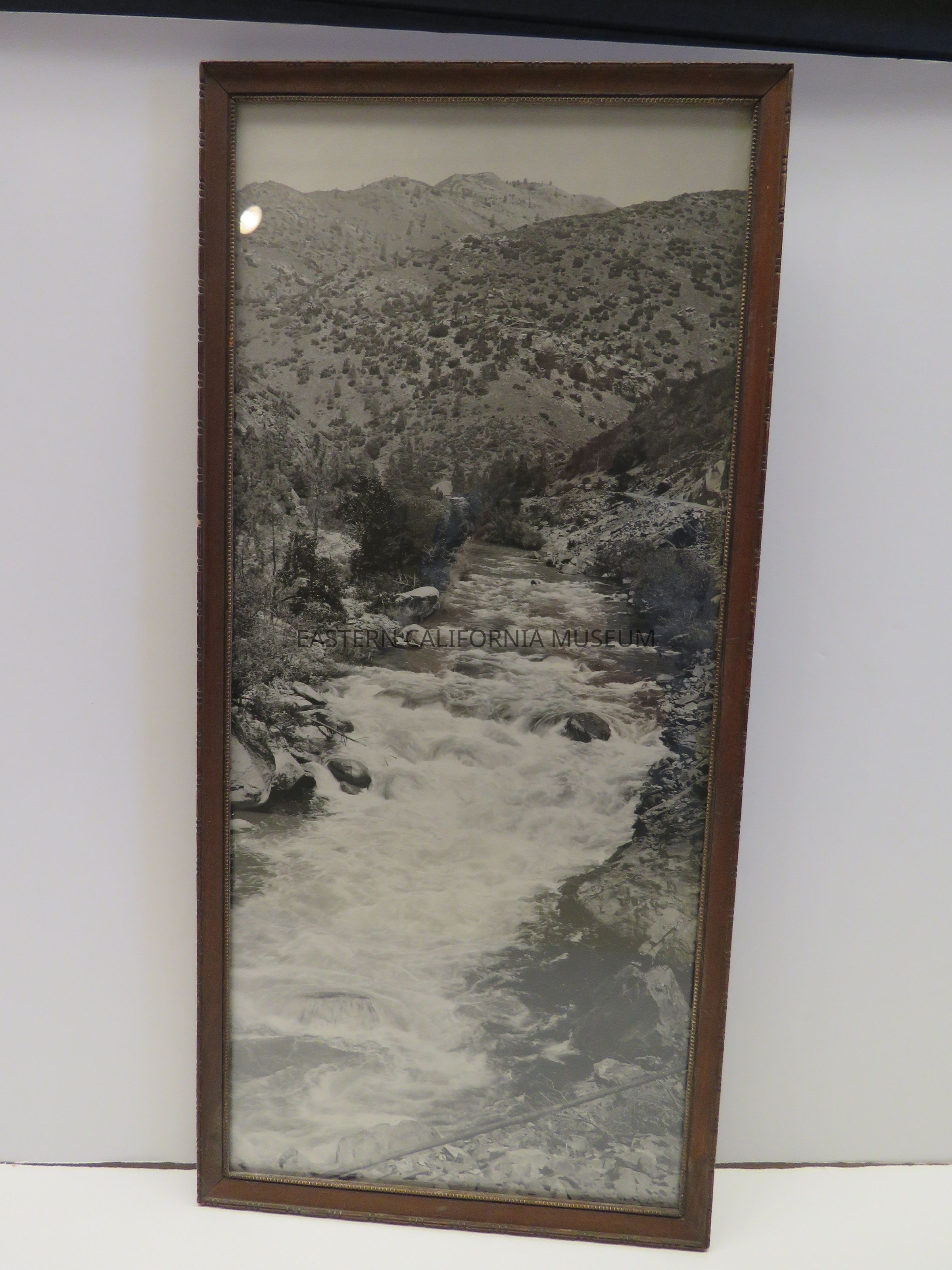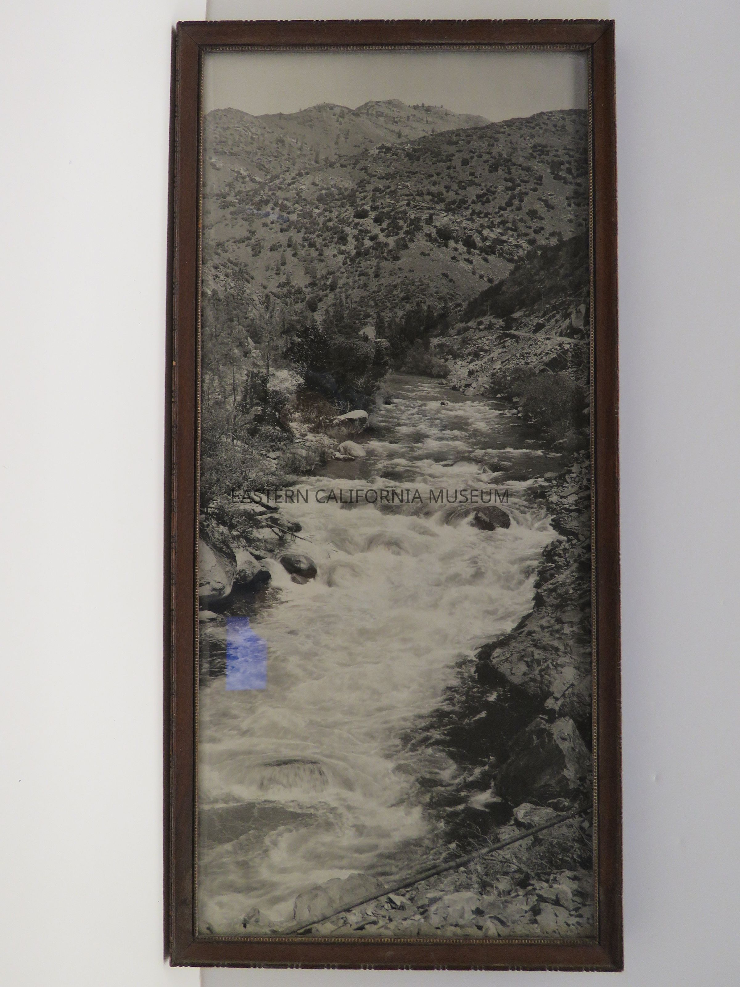 Framed vertical panorama photo of a rushing river. There appears to be a road on the right side and a pipe in the foreground near bottom.