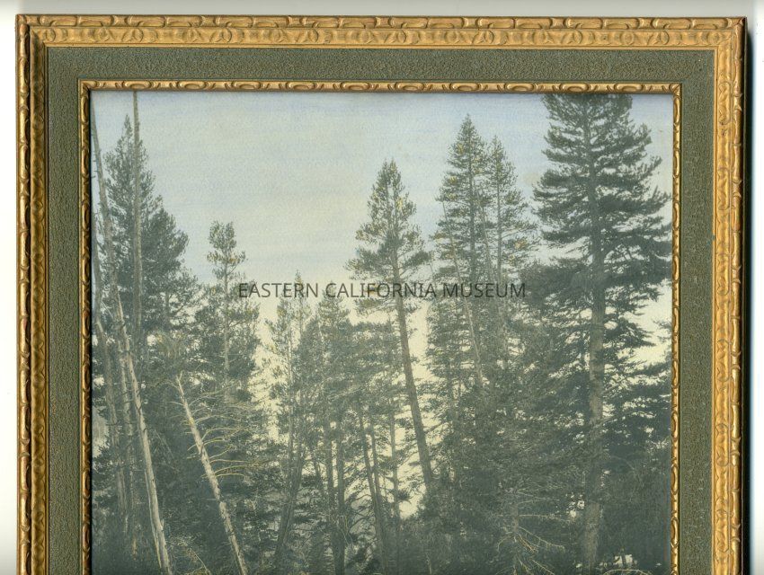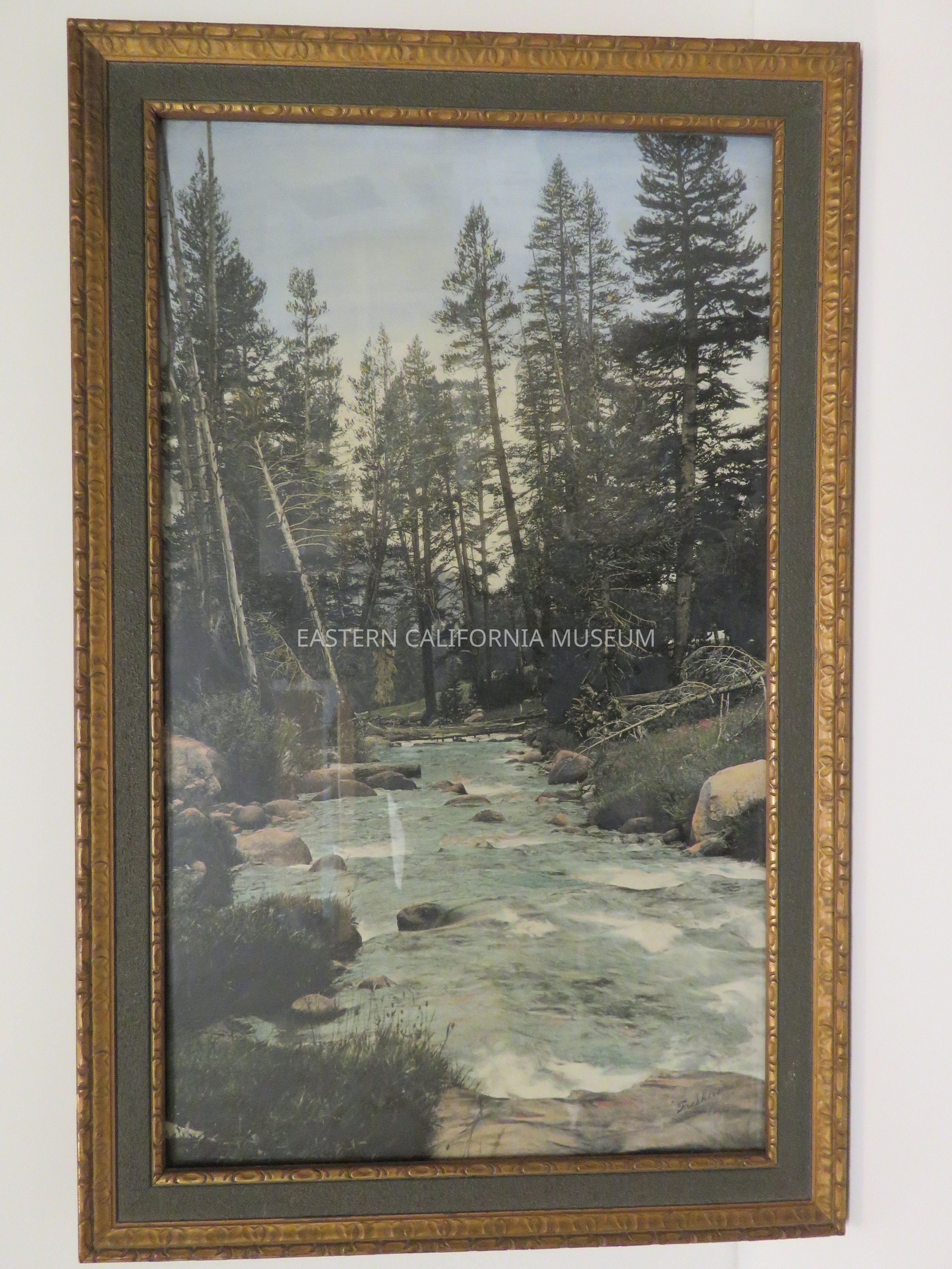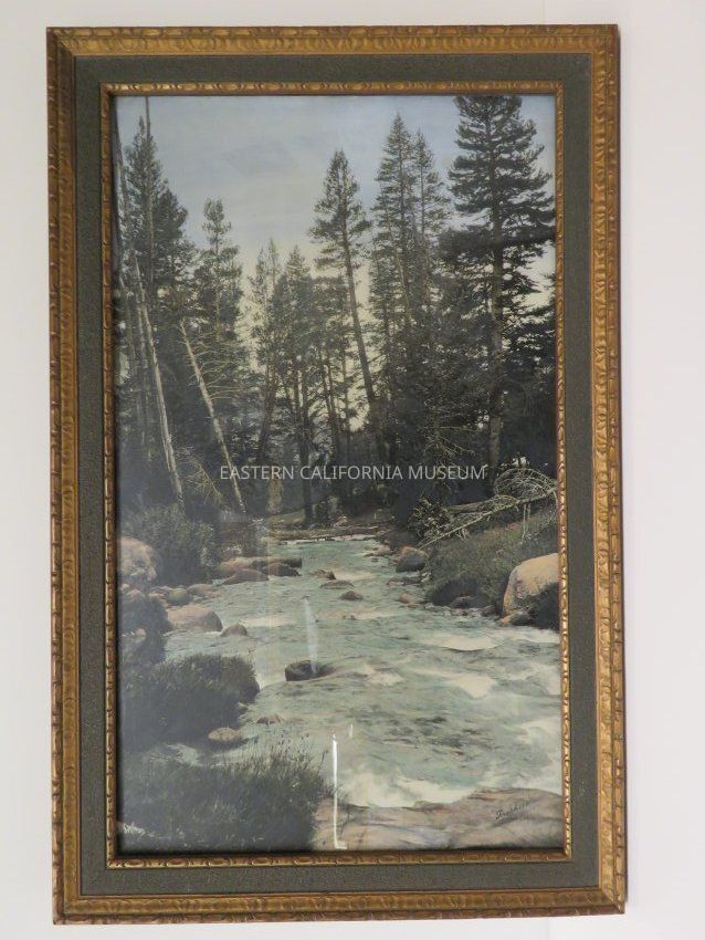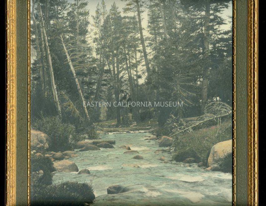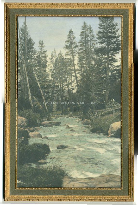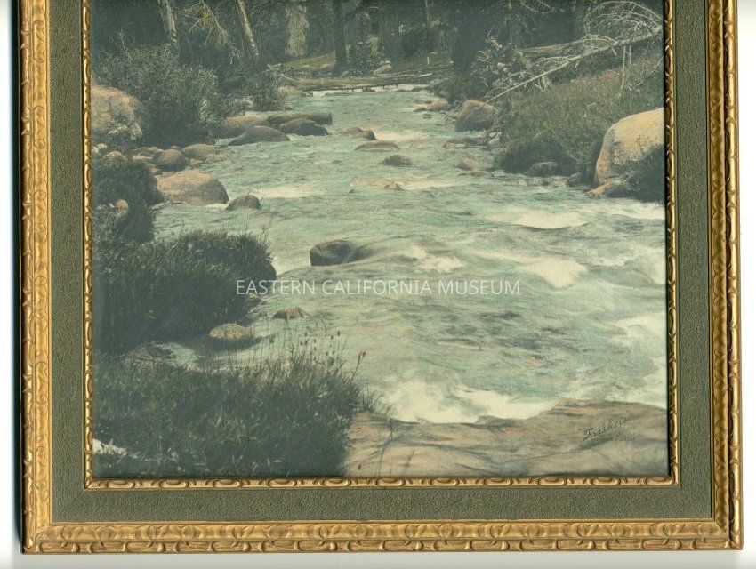 Framed hand-tinted photo of a Sierra stream. Another copy of this print in the museum is labeled, "Rock Creek." Photo by Burton Frasher.