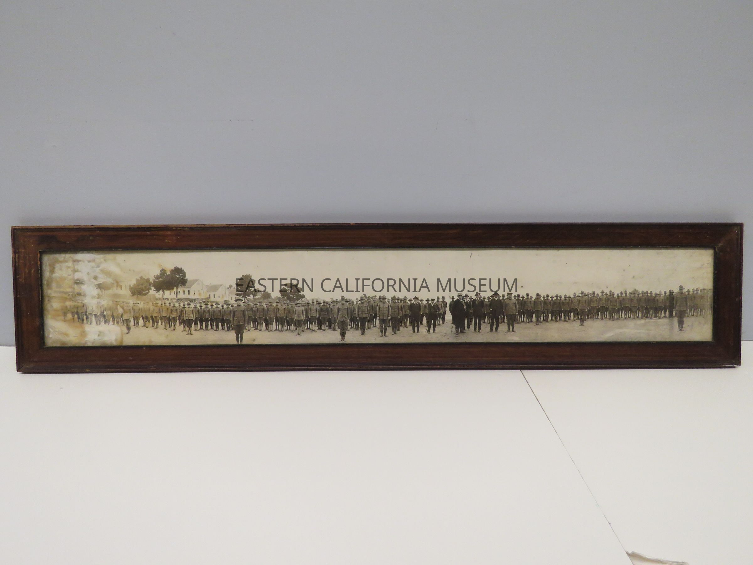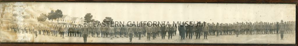 Panoramic photo of a military group (battalion?) at the Presidio of Monterey, California, mostly likely during WWI. There are several early vehicles in the background on the left side. There are five men in dark suits where white flowers in their lapels in the center of the photo.Collection