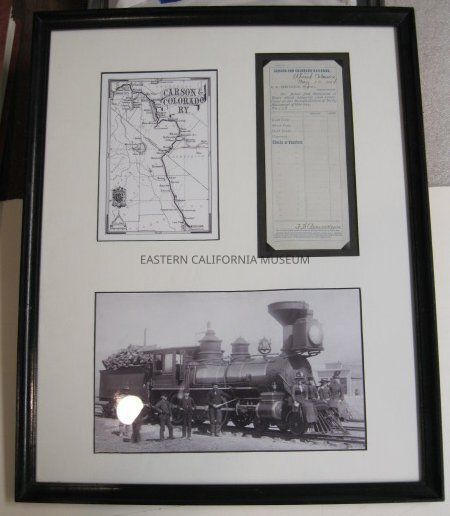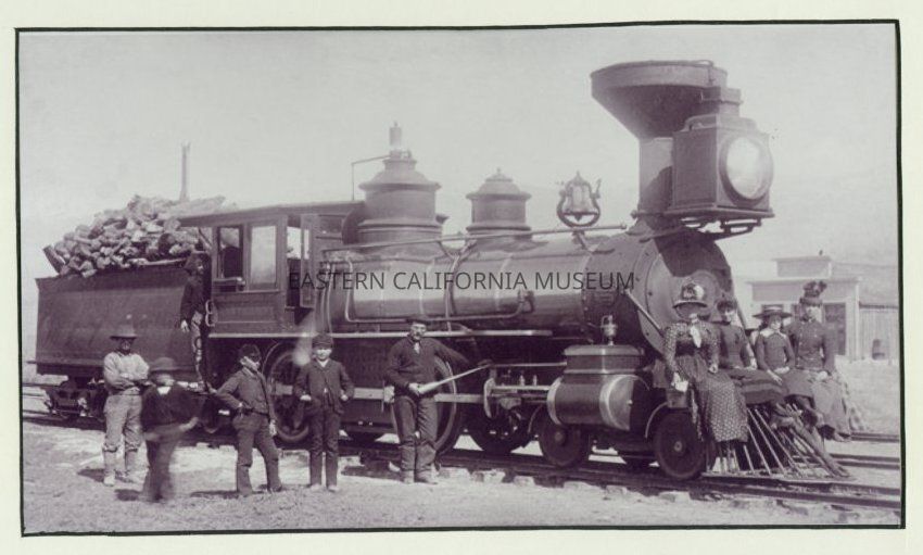Enlarged copy (not original) of a photo of a locomotive. There are four women sitting on the pilot and five men standing to the left. It has been identified as a Carson and Colorado Railway engine #6, the Hawthrone, circa 1884, parked at the stateline between Nevada and California.Collection