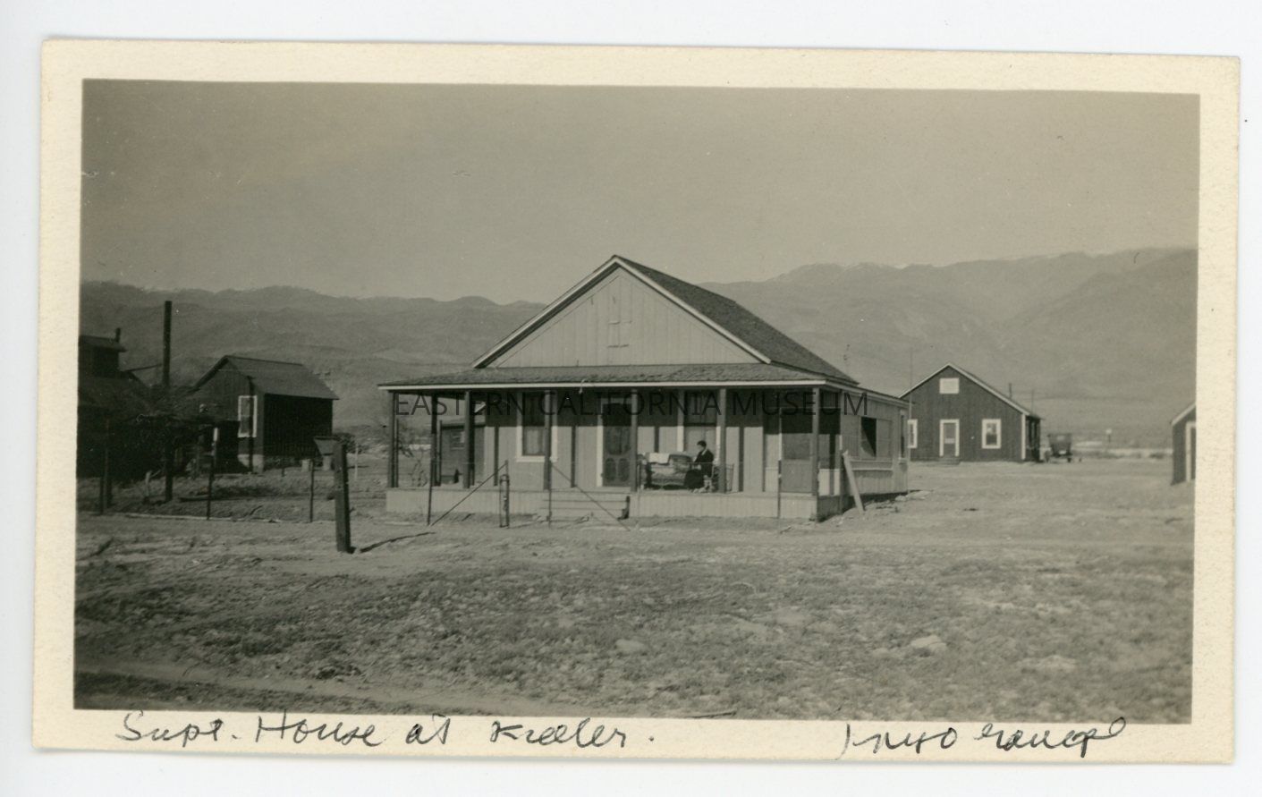 Photo captioned, "Supt. [Superintendent's] house at Keeler, Inyo range." It shows a house in the center with a person sitting on the front porch. THere are other structures around it and mountains in the background.