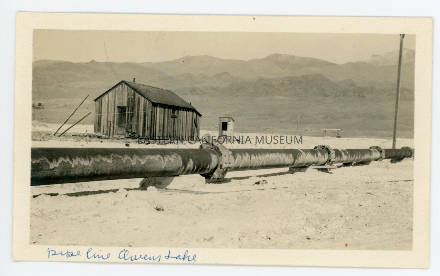 Photo captioned, "Pipeline Owens Lake." It shows a wooden building/shack with a metal pipeline in the foreground. There are mountains in the background.