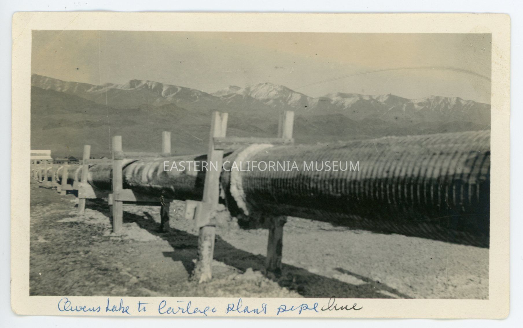 Photo captioned, "Owens Lake to Cartago plant pipeline." It shows a raised or elevated pipeline on wooden trestles with a building and mountains in the background.Collection
