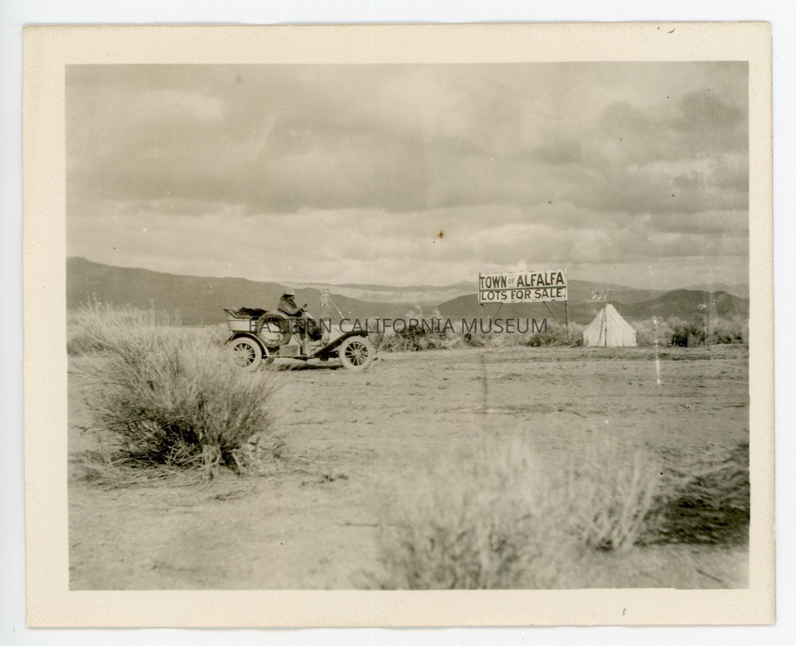 Photo of an automobile parked by a sign that says, "Town of Alfalfa / Lots for Sale." There is a single white, canvas tent beside the sign. It looks like there are two men inside the car (one for certain). There are some shrubs/bushes in the foreground and mountains in the background.