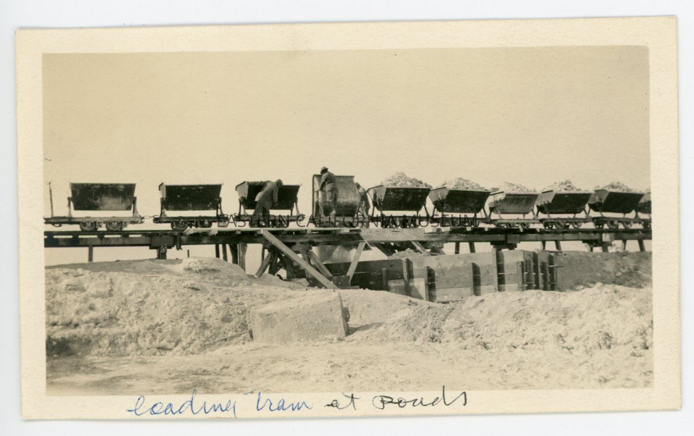 Photo captioned, "Loading tram at ponds." It shows two men dumping the carts full of white material (soda ash?) into a wooden box below. The carts are on an elevated or raised railroad track.