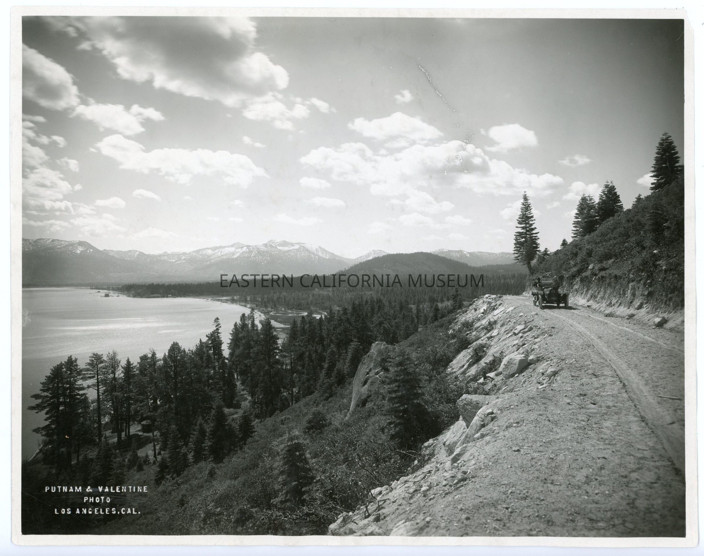Photo of an automobile parked on a dirt road along the edge of a cliff with a large lake at the bottom. There are snow-covered mountains in the background. It was taken or printed by Putnam and Valentine of Los Angeles, whose name is embossed in the lower left corner.