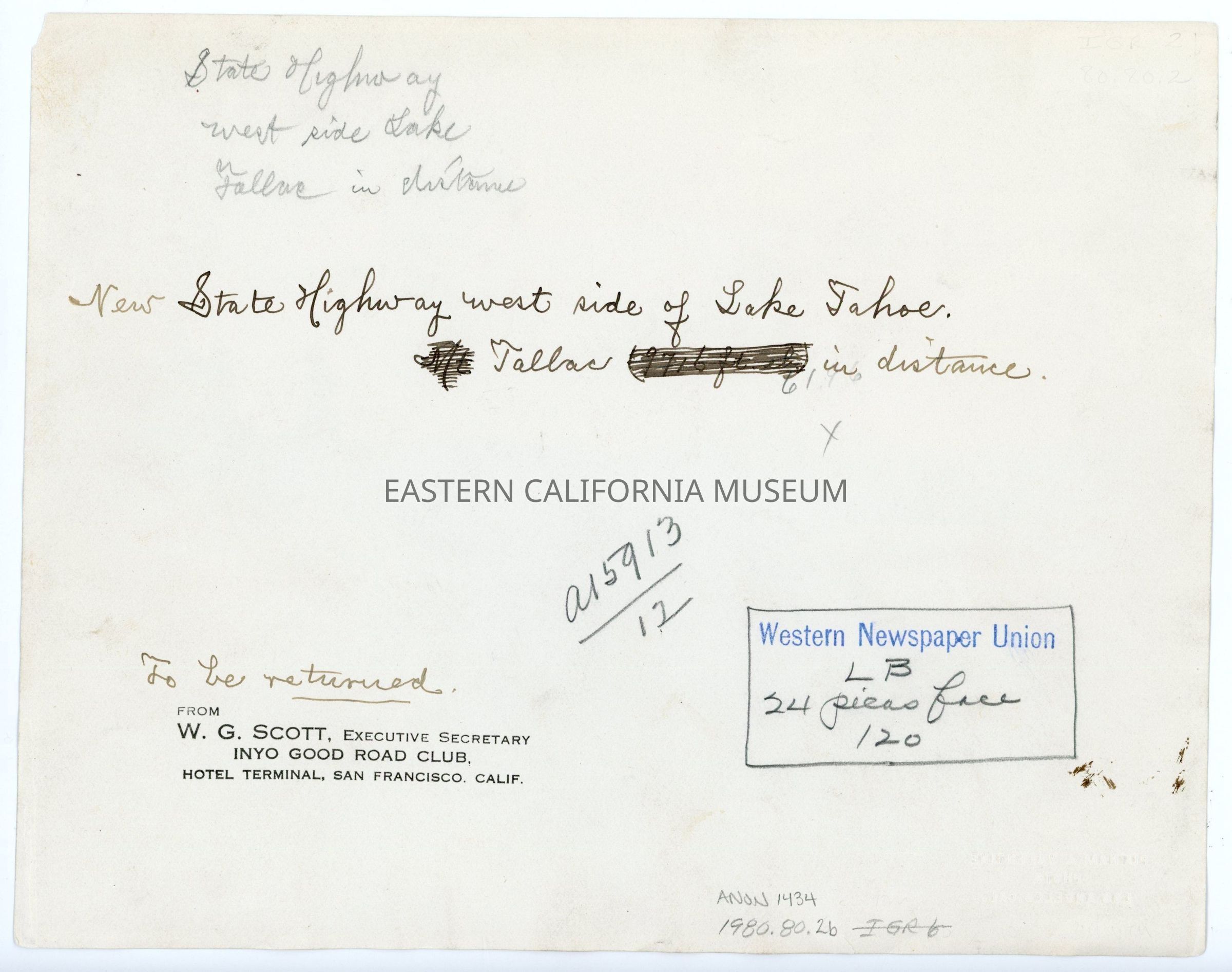 Written in a variety of pens and pencils on reverse: State Highway, west side lake, Tallac in distance. New state highway west side of Lake Tahoe. Tallac in distance. To be returned. A15913/12.Made/Created