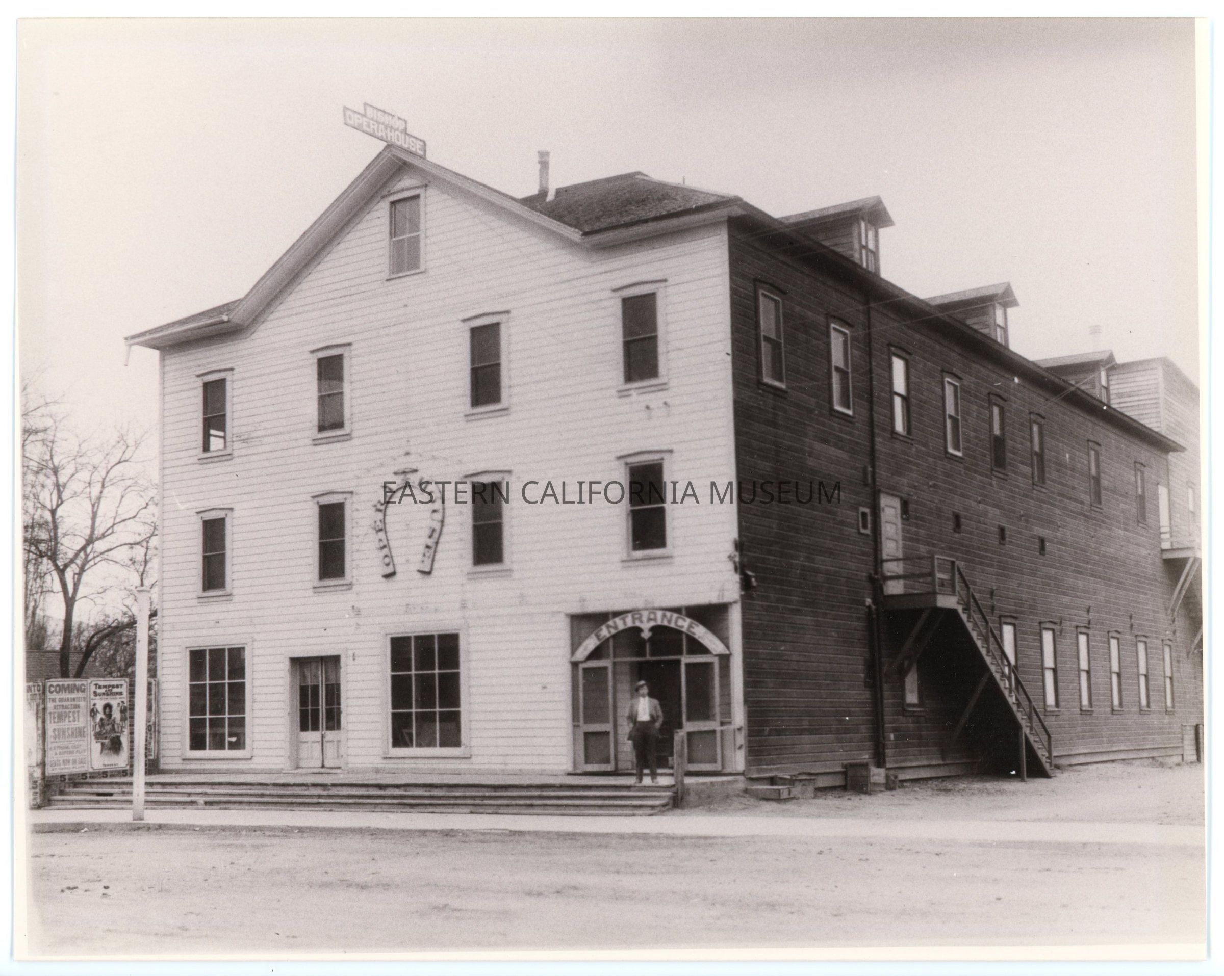 Copy of a photo of the Bishop Opera House. It shows a tall three or four story wood building with a large horseshoe sign that says "Opera House" in center of second floor. There is a man standing under the entrance sign at the door and advertisements for "Tempest and Sunshine" on the far left side. Harry Holland was the owner of the Opera House.Photograph Details