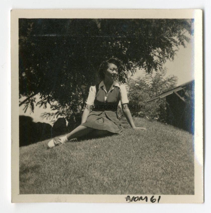 Woman identified as Mary Nomura sitting in a grassy area with tree, row of shrubs, and building in background. Likely one of the Manzanar War Relocation Center gardens.Photograph Details