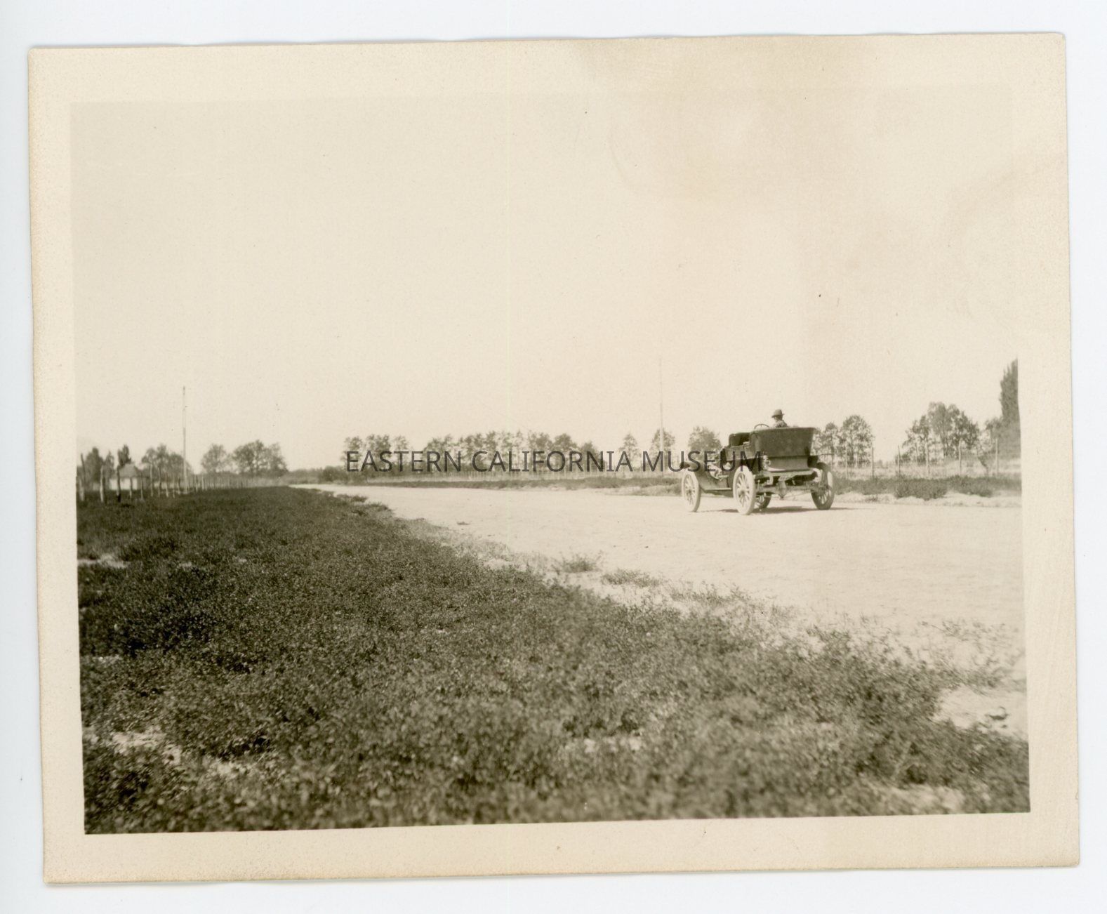 Photo of an automobile parked on a dirt road with one man sitting in it. There are trees in the background, and in the foreground is a short plant ground covering. There are fences on both sides of the road. It looks like there is a building in the distance to the left side, and maybe two power poles. According to the accession book, the location might be the (proposed?) town of Alfalfa.